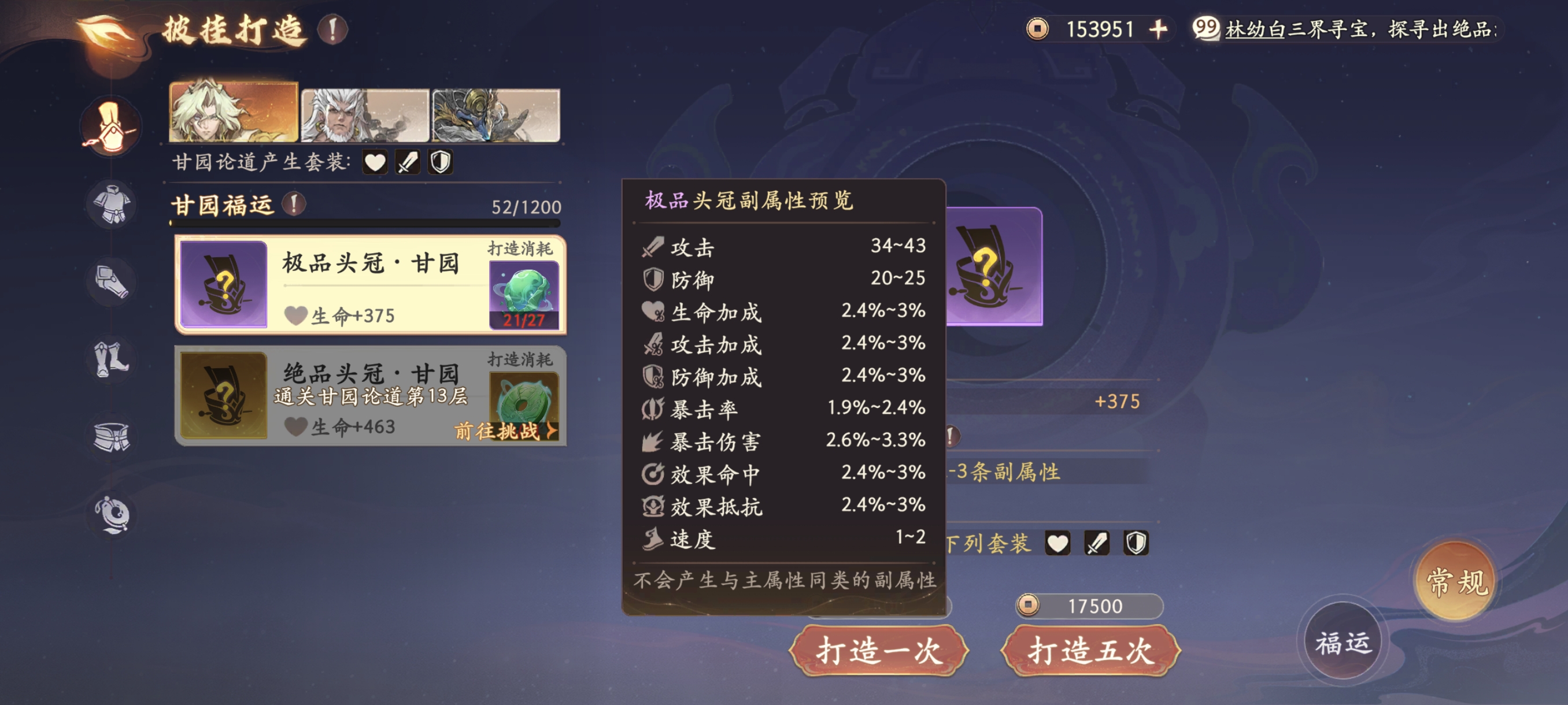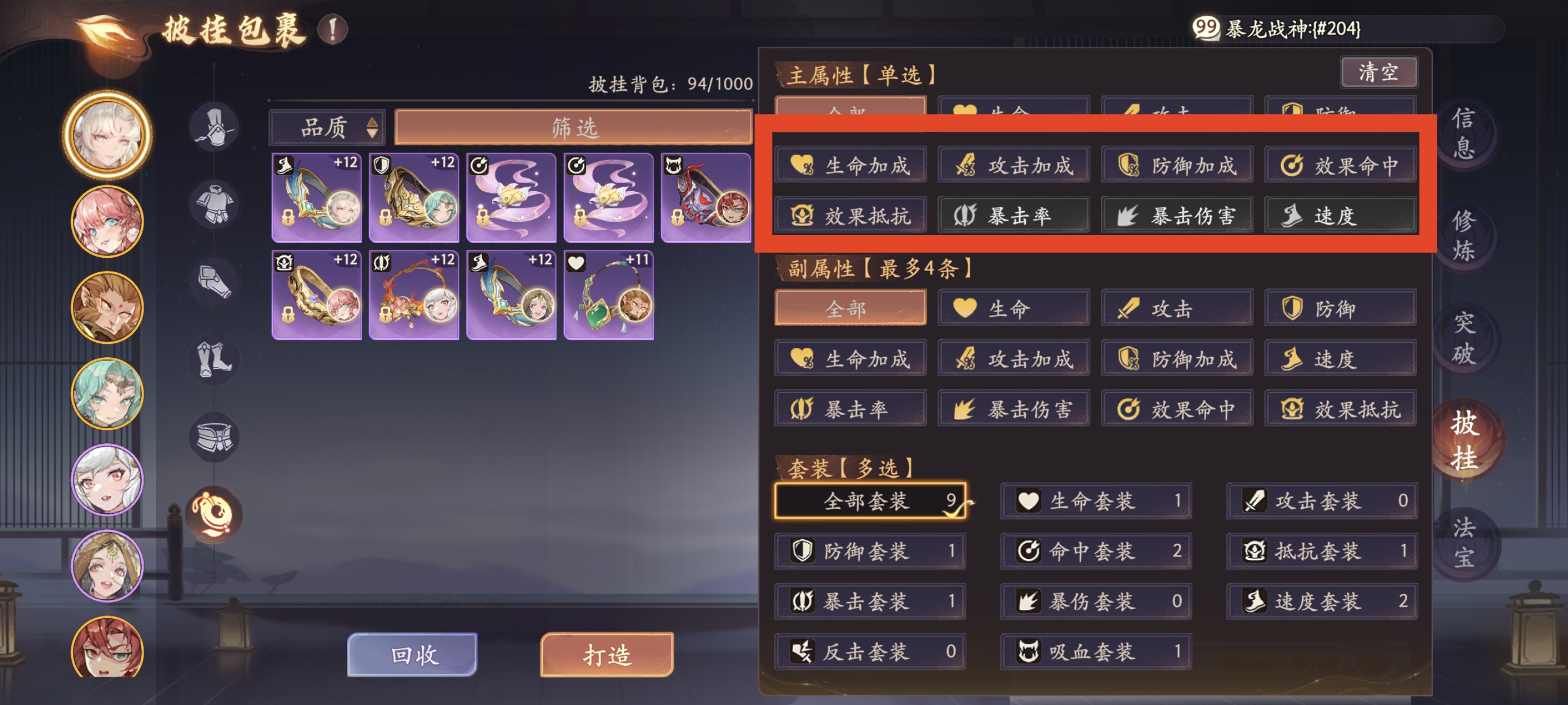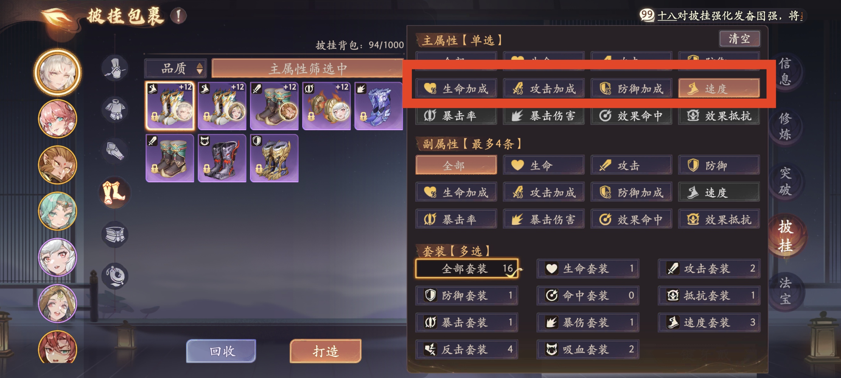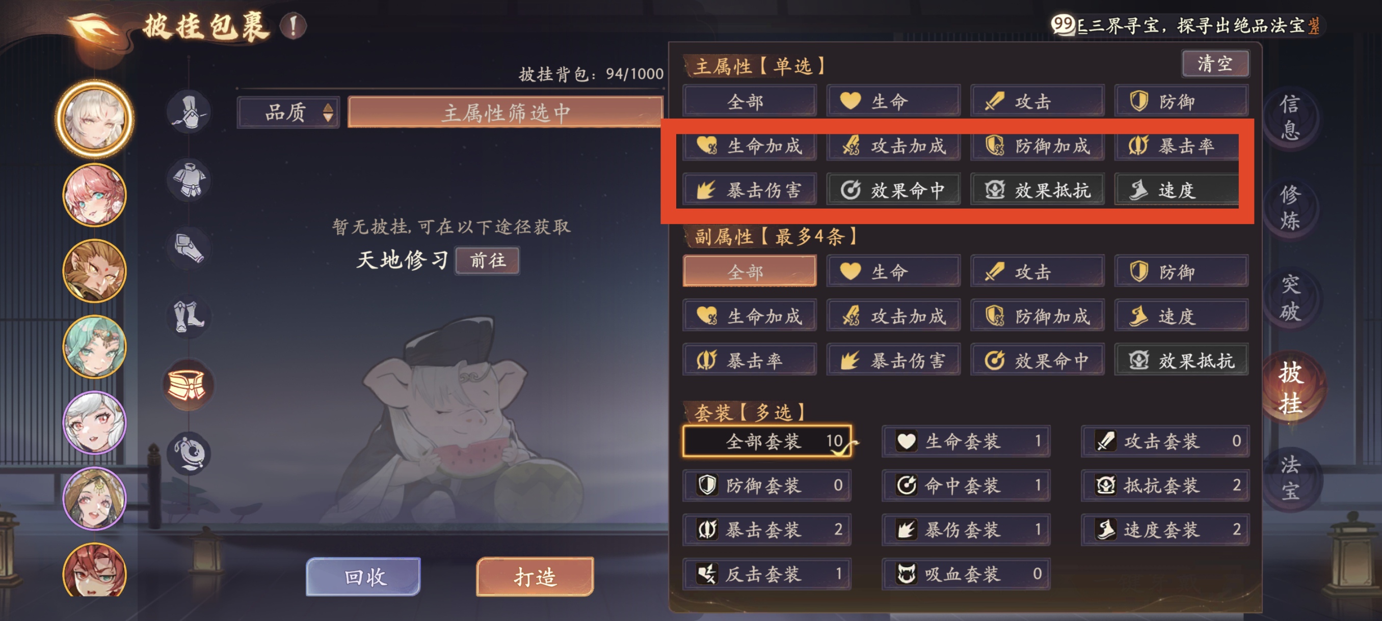 最简单的三种披挂为头、衣、手三个部位,这三个部位主属性固定不变,只需要刷取自己需要的副词条即可。