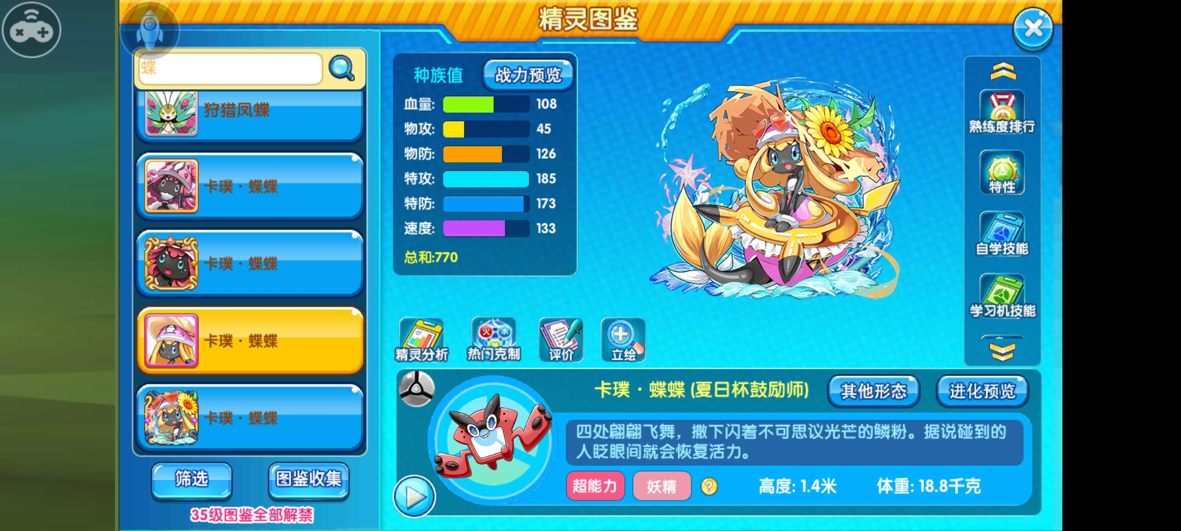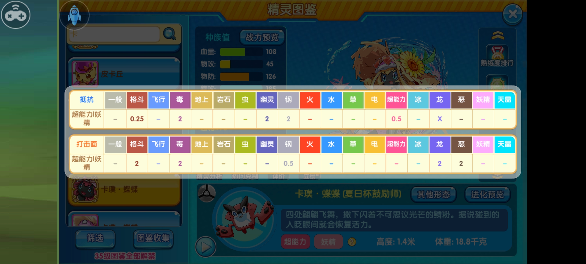 卡噗蝶蝶(夏日杯鼓励师)是一只超能+妖精的双属性精灵。 属性弱点只有3个(毒、幽灵、钢),被克制的这3个打击面都不算特别主流。抵抗格斗、超能还可以免疫龙。这样看的话优秀的种族值搭配还不错的抗性可以让其成为一个不错的联防精灵。