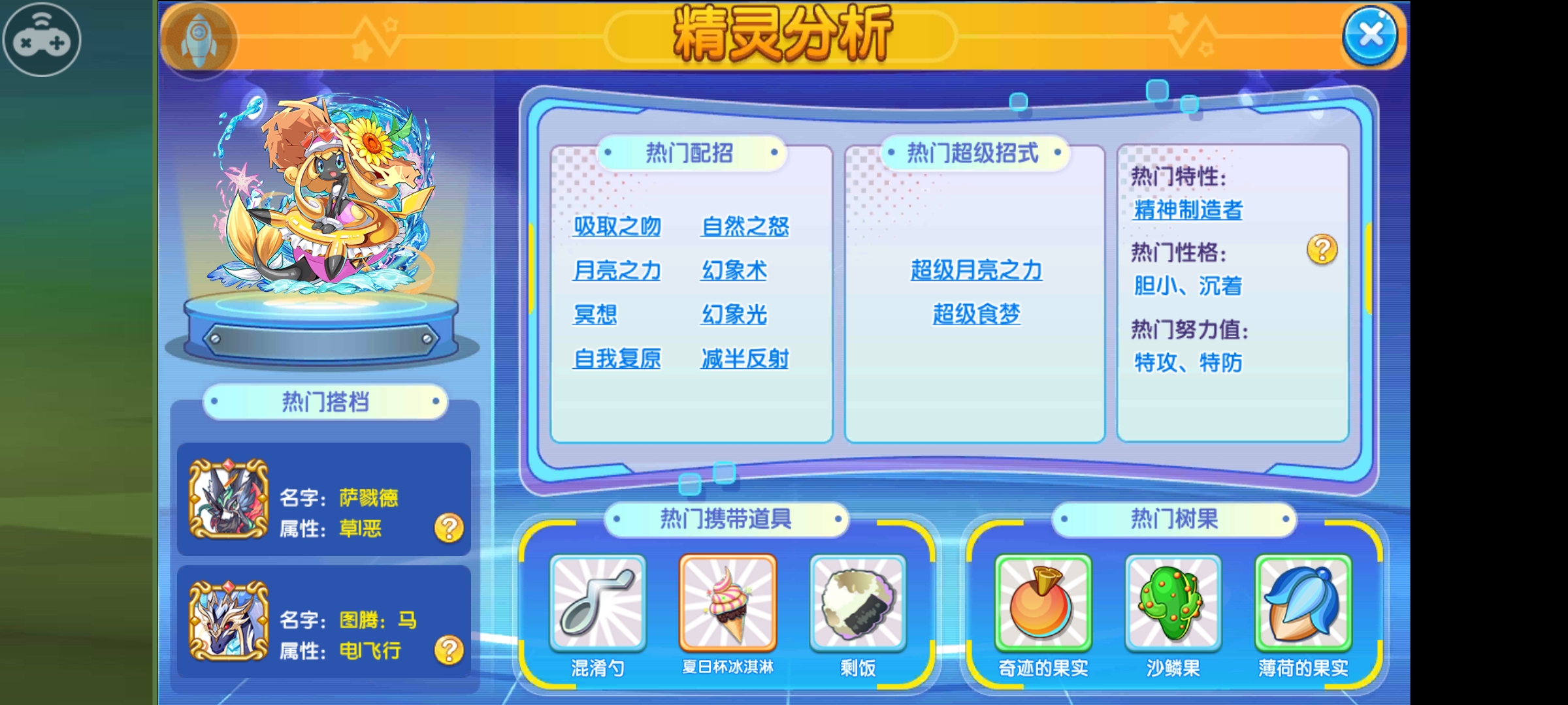 配招的话我推荐的是冥想、十万伏特、吸取之吻、急冻光线。其配招就是补输出盲点,这里会有一些人问了为什么不带月亮之力,因为冥想一次的吸取之吻基本相当于月亮之力加自我复原,大招的话开至高精神破坏波。这个大招的话主要还是打妙蛙和补一些伤害用的。携带物的话剩饭和防爆头盔都是不错的选择。