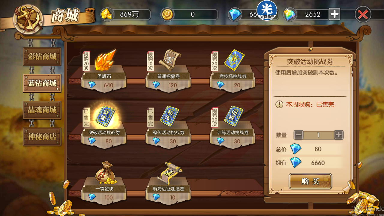 【1、蓝钻商城】每周先把突破、秘传的挑战券给买满,等到开服庆典过后的双倍活动,疯狂加满来刷,让自己的角色技能加点能跟得上,其次是三突破。至于训练,毕竟是前期,等你100级的时候,都不知道又出了多少个新角色了,所以前期不着急训练。
