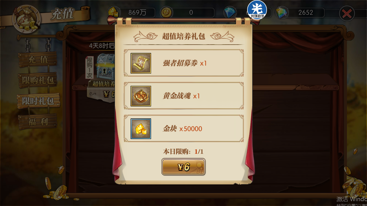 插一下题外话,这时候,家境还可以的小伙伴,可以考虑下限时礼包648元150金魂,每天限购一次,这样大概花个2000块就可以有两个八星,接下来的主线会非常非常舒服。学生党就不要打这个算盘了哈,一定要量力而行,玩游戏而已。对于刚出社会报道的毕业生,6元礼包1张强者1金魂倒是可以考虑下。