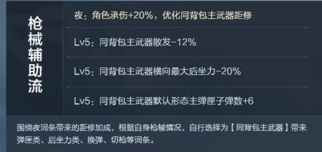 双刃-昼伏夜影觉醒可谓是山海经模式中的最强辅助近战。词条选择上,更多玩家愿意勾选对背包主武器有优化的词条。比如“夜”词条中优化背包主武器距修则会直接影响最终的输出伤害。而减少主武器散发和后坐力的词条主要针对步枪、机枪等武器,增加主弹匣子弹数量主要针对霰弹枪类武器。