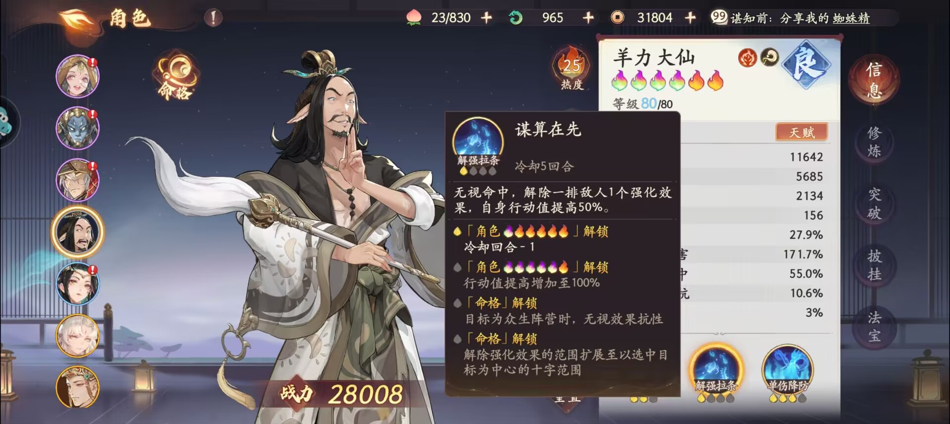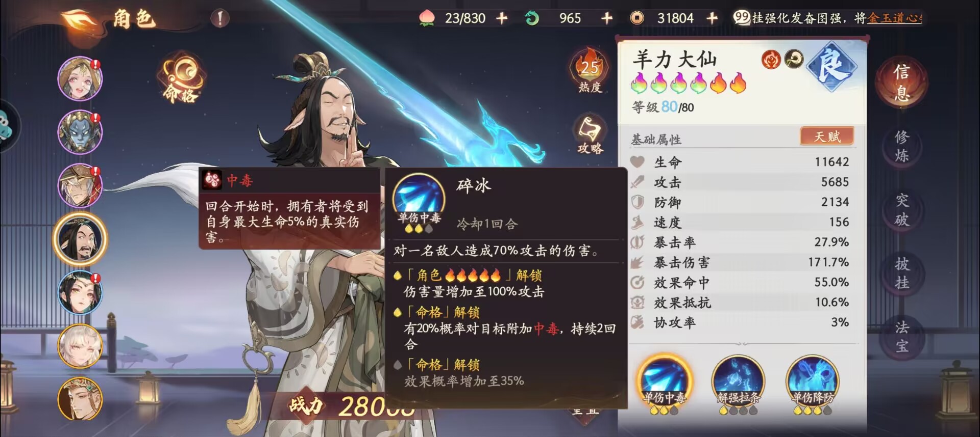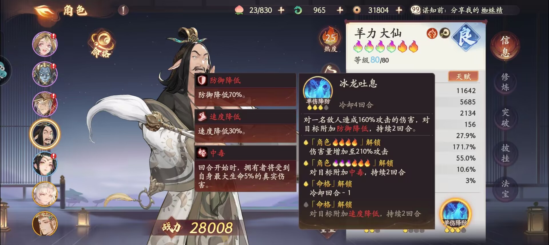 羊力大仙一技能唯一缺点就是中毒机制太低了,如果遇到抵抗高的敌人,更难挂,所以羊力大仙一定要推【效果命中】哦。