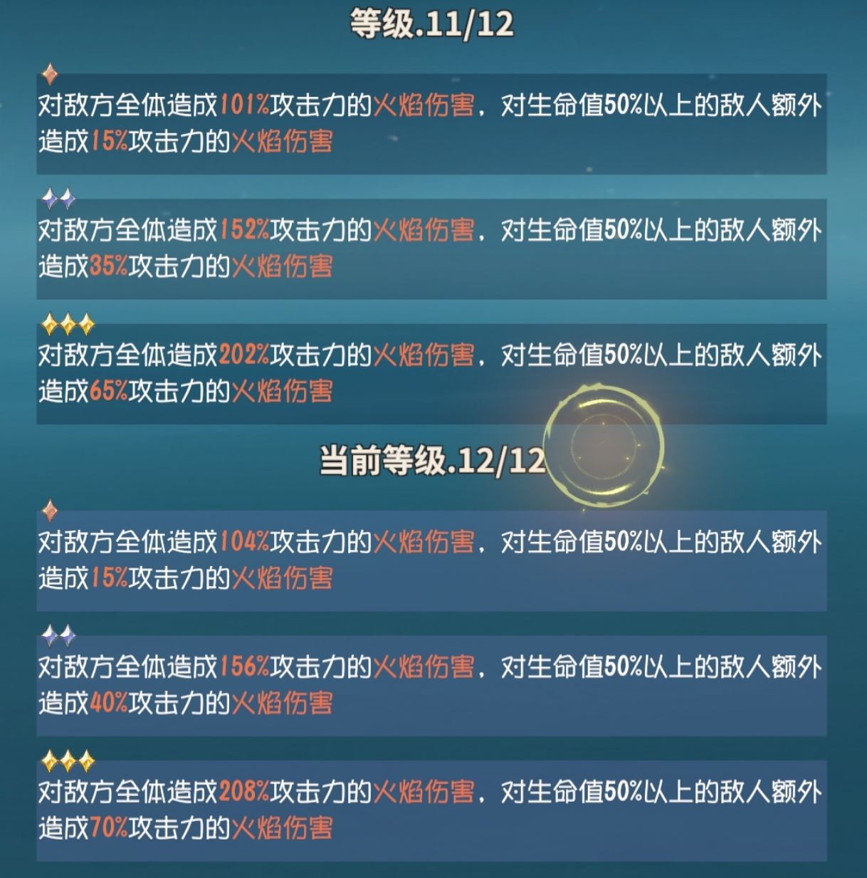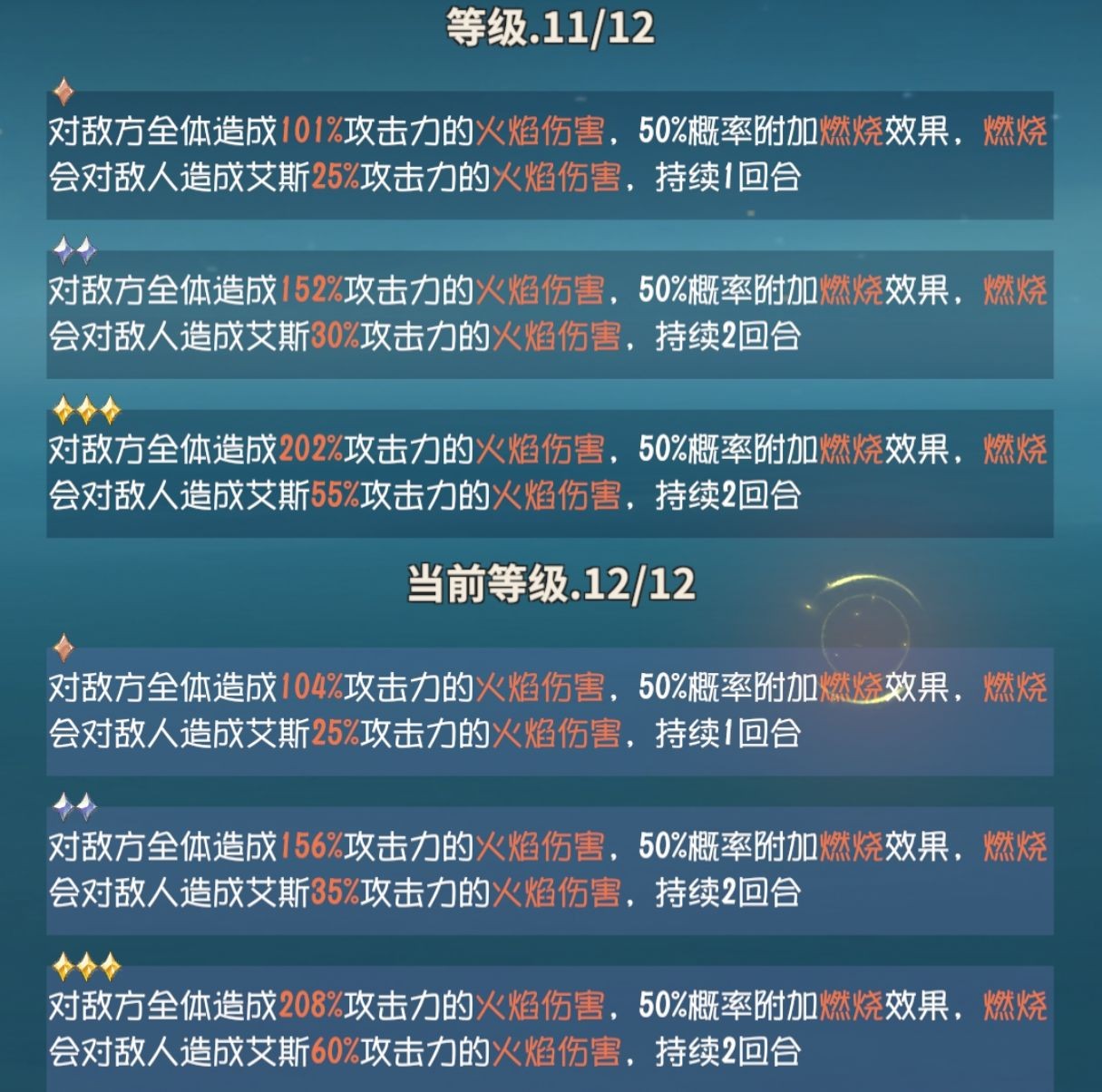 以银卡看10到12级,基础系数提升外,还增加了5%燃烧的火焰伤害,小小的二次增益.