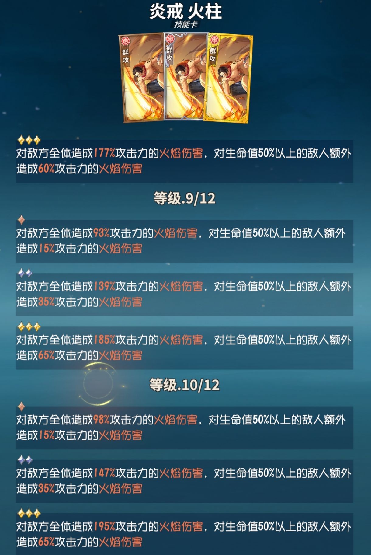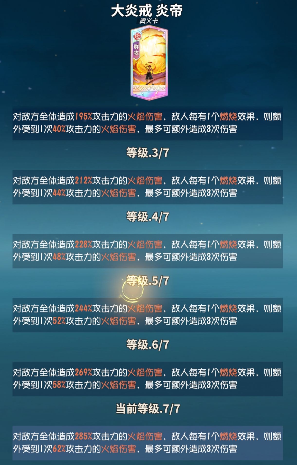 奥义:相比5-6级技能的伤害质变,7级奥义看起来比较谨慎,但针对多层燃烧目标伤害上限提升也有,最多可以多3次4%