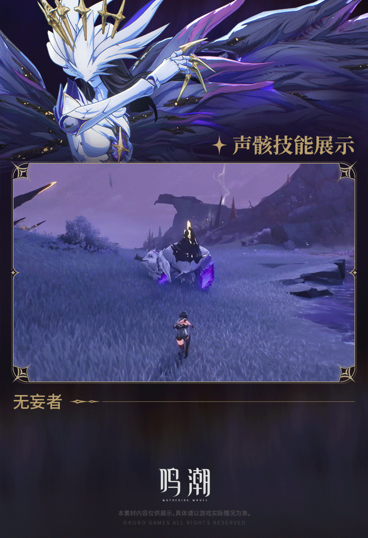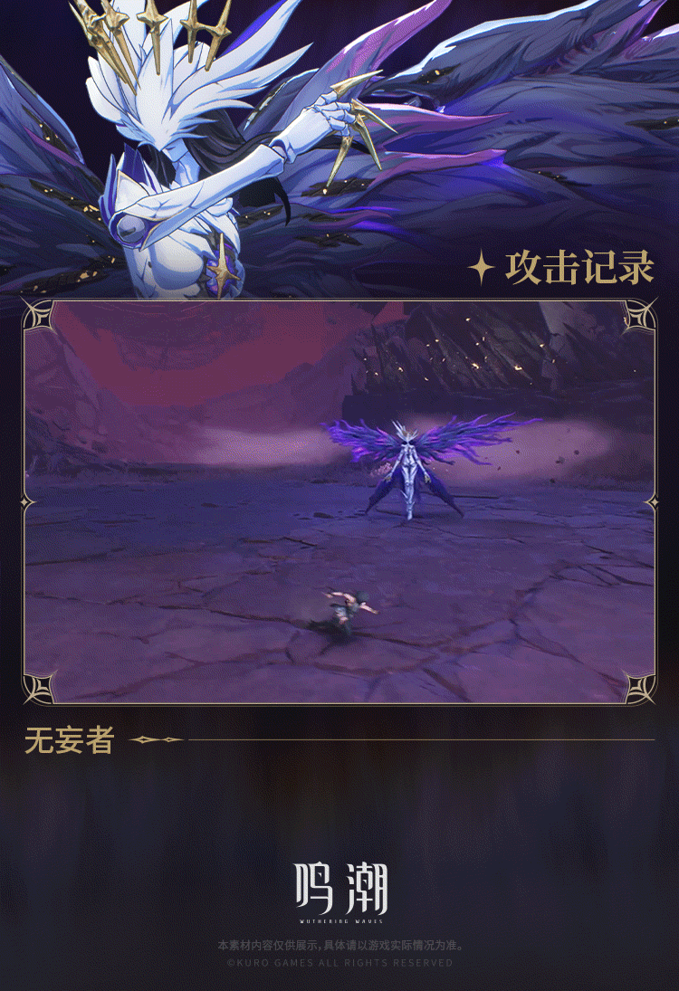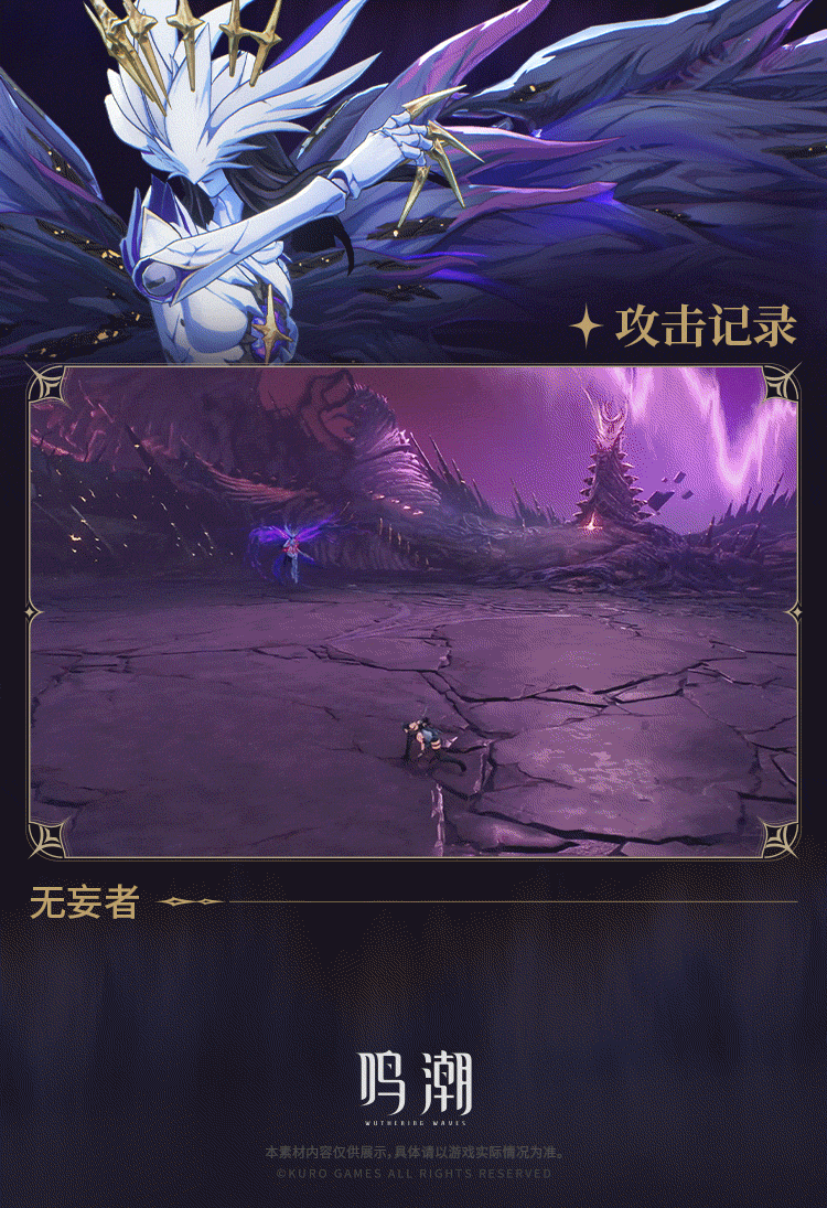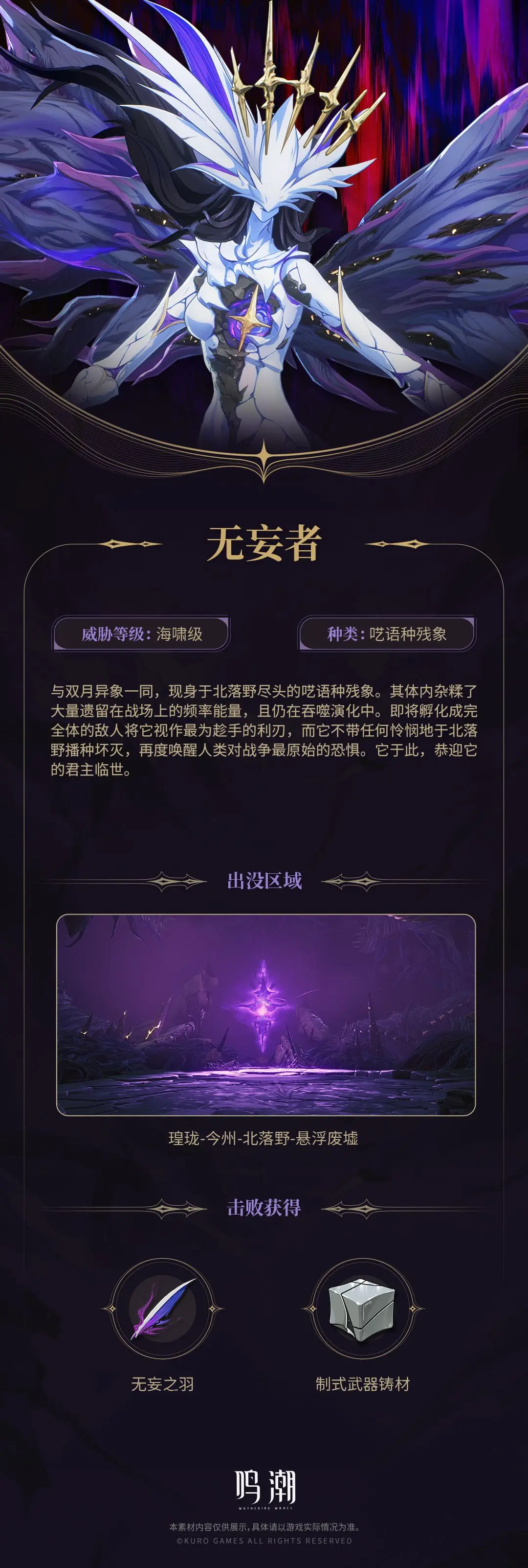 《寰宇人类注疏:威胁集录》——无妄者鸣潮 - 新闻星发布于 2024-05-27关注出现于北落野的呓语种残象,有较明显的人类女性体征。疑似与鸣式存在某种联系,周身伴有其他次等级残象聚集,因其所处环境险恶,尚未掌握足够的信息和纪录,已知危险度隶属于海啸级。