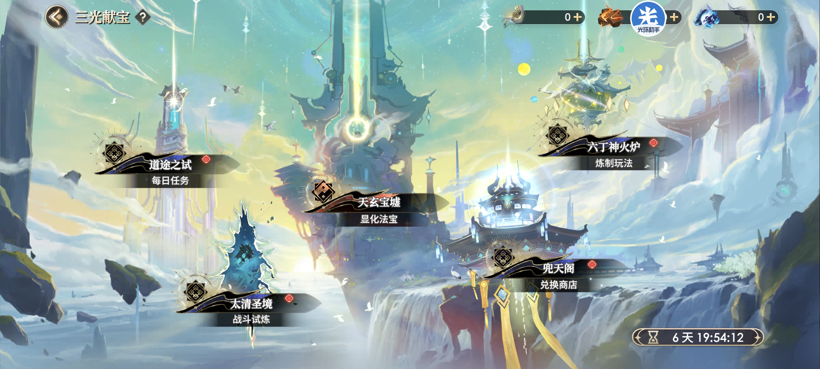 二、三光献宝整个大活动分为5个小模块构成,分别为道途之试、天玄宝墟、六丁神火炉、太清圣境、兜天阁。