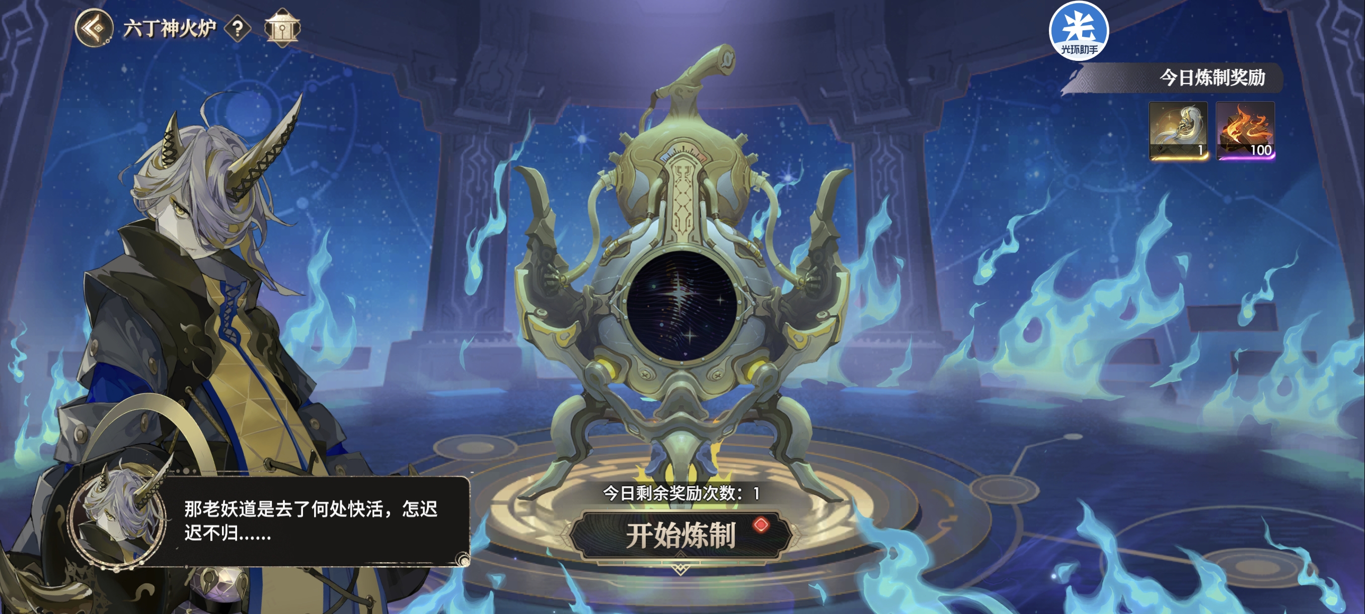 炼丹小游戏,每天日完成可获得1个法宝抽+100神火炉薪。