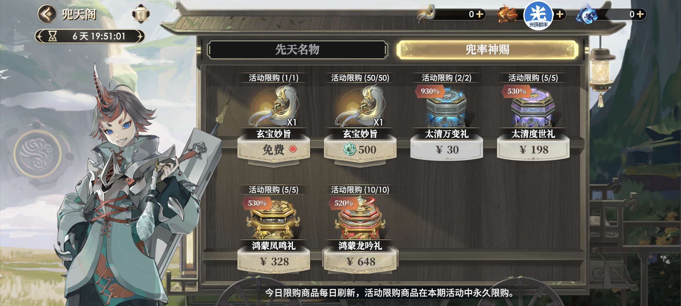 白送1个法宝抽,可用2.5W玉宝相购买50个法宝抽,以及氪金不同档位获得相应的法宝抽。