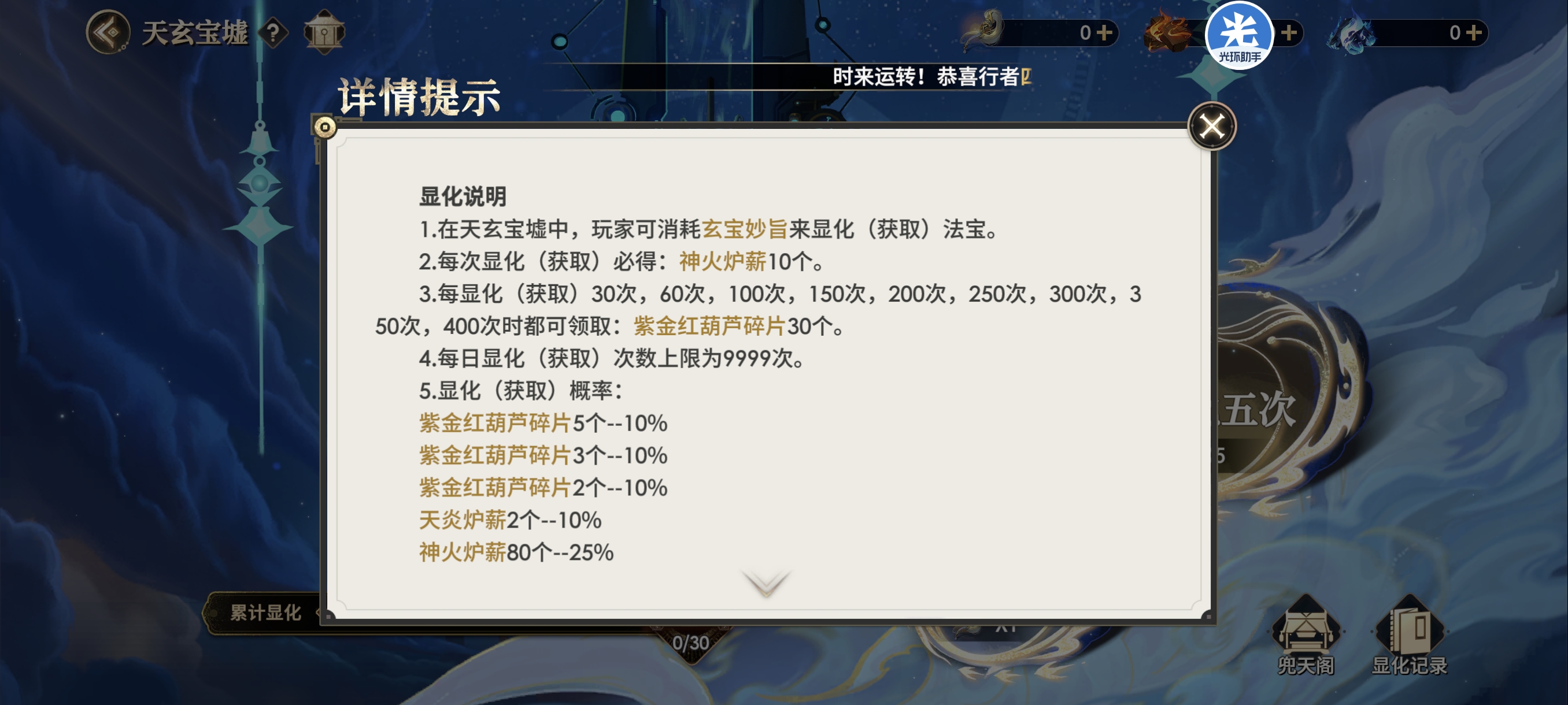 每日完成日常任务,即可获得1个玄宝妙旨(以下简称为法宝抽)+2个天炎炉薪+150个神火炉薪。