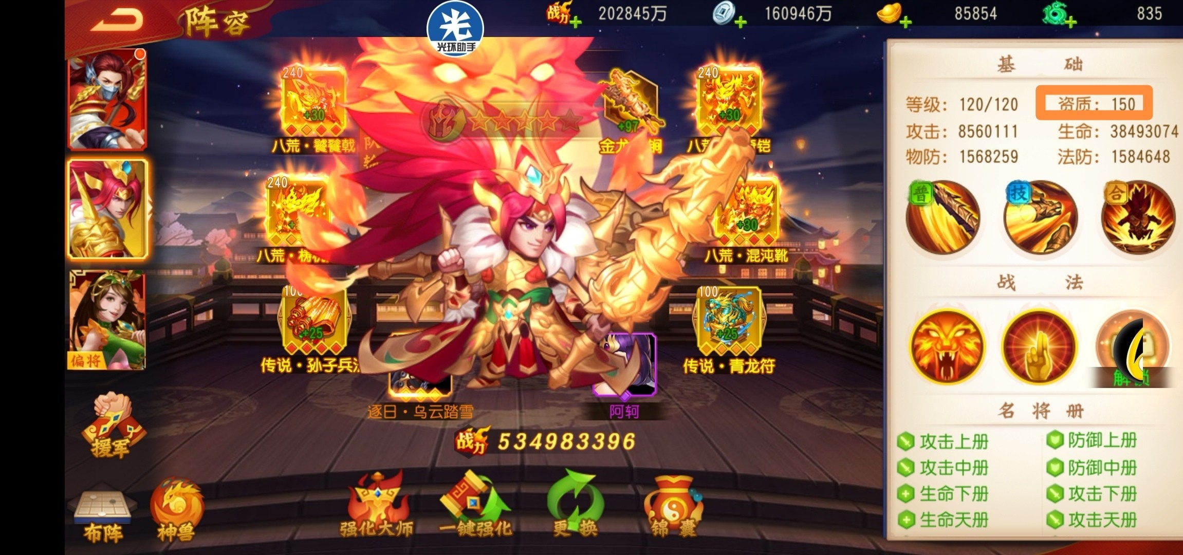 2。有一红将一金将的资源。那么选择火神孙策+水镜。火神孙策高爆发输出配合水镜的收割。可以快速让对手减员。如果选择搭配火神孙策+子上。碰到对手肉将带扑朔迷离金锦囊放后排会卡火神孙策+子上伤害。有这个局限性往往决定一场战斗的胜利几率。而水镜攻击目标是双纵排没有这个局限性。