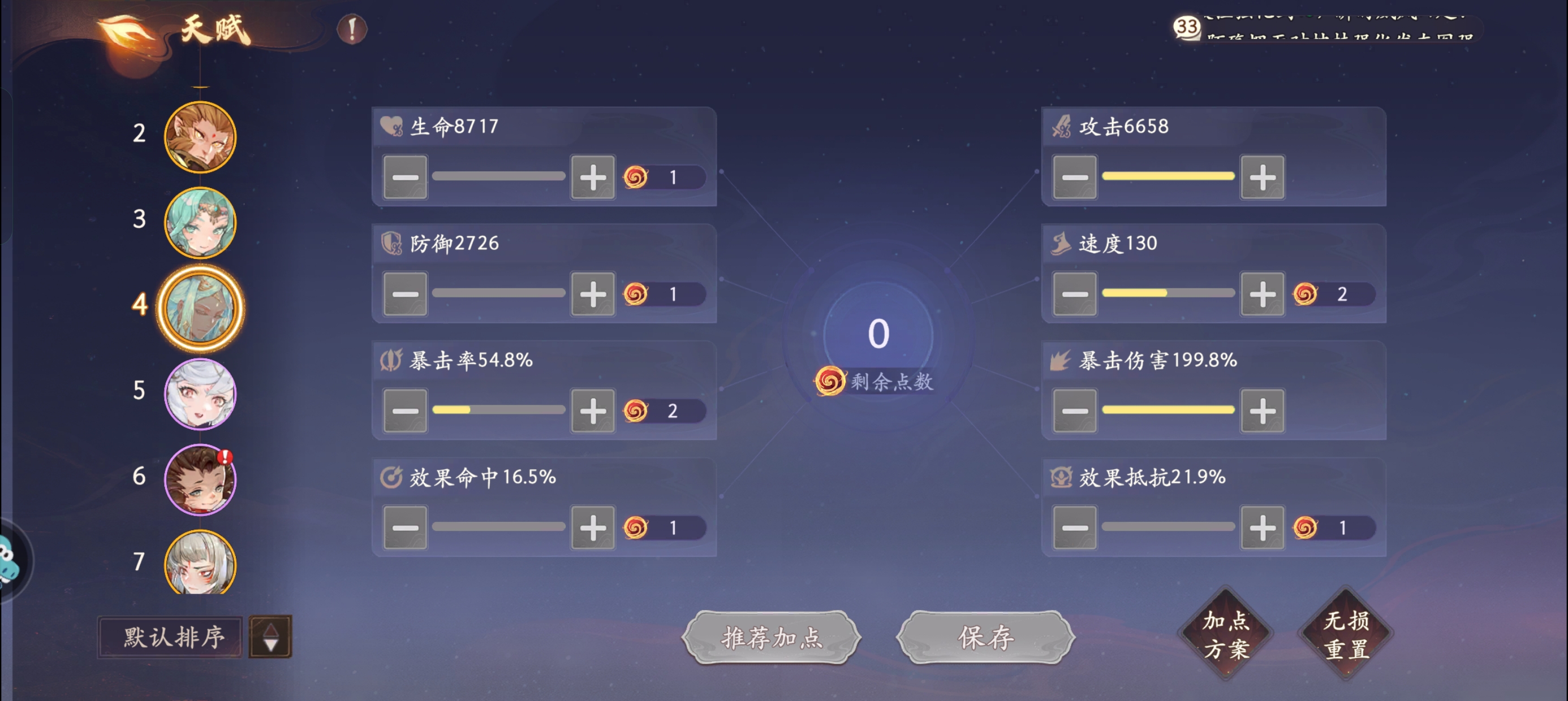 2:【天赋】加点顺序推荐:暴伤>暴击>攻击>速度。前期暴击不够,可优先加暴击,提高暴击率,增加实战输出伤害。