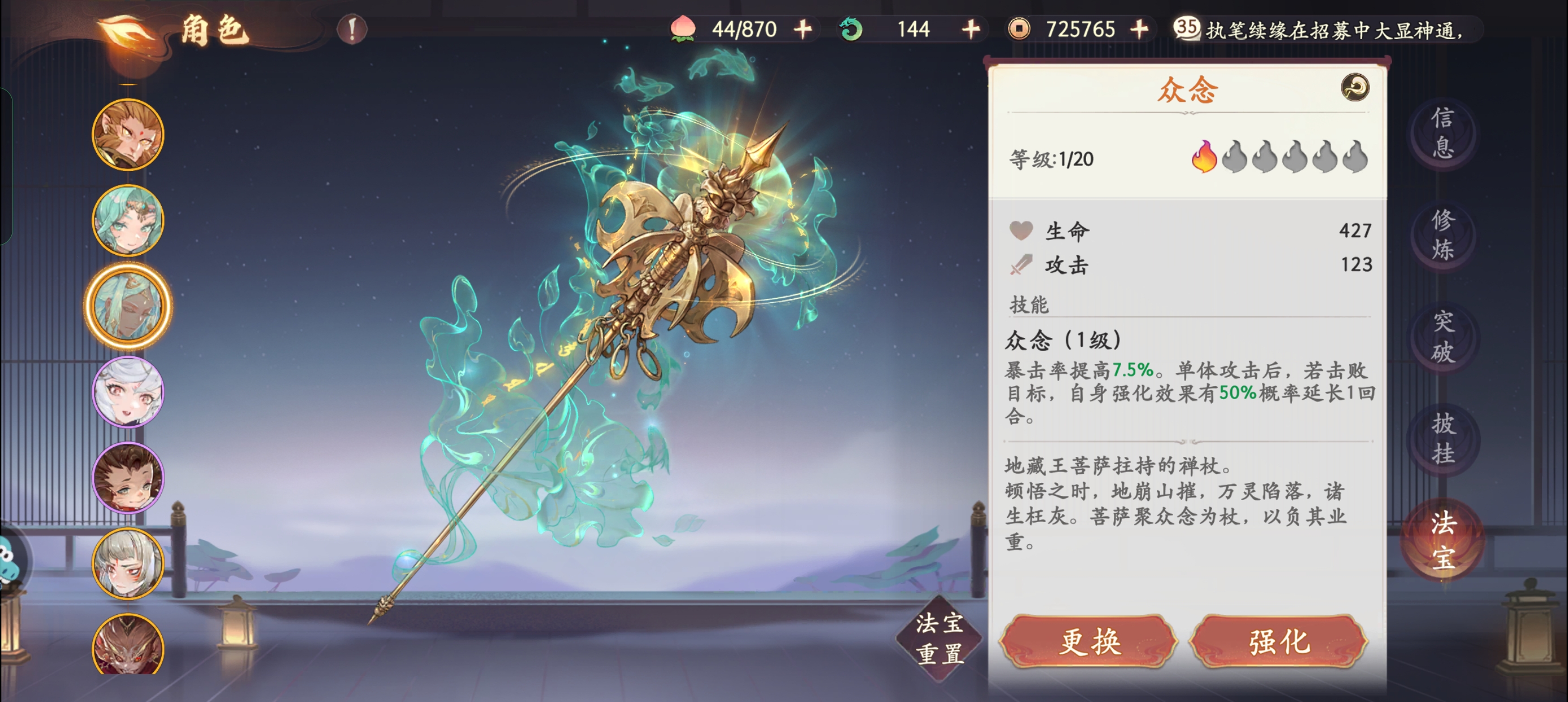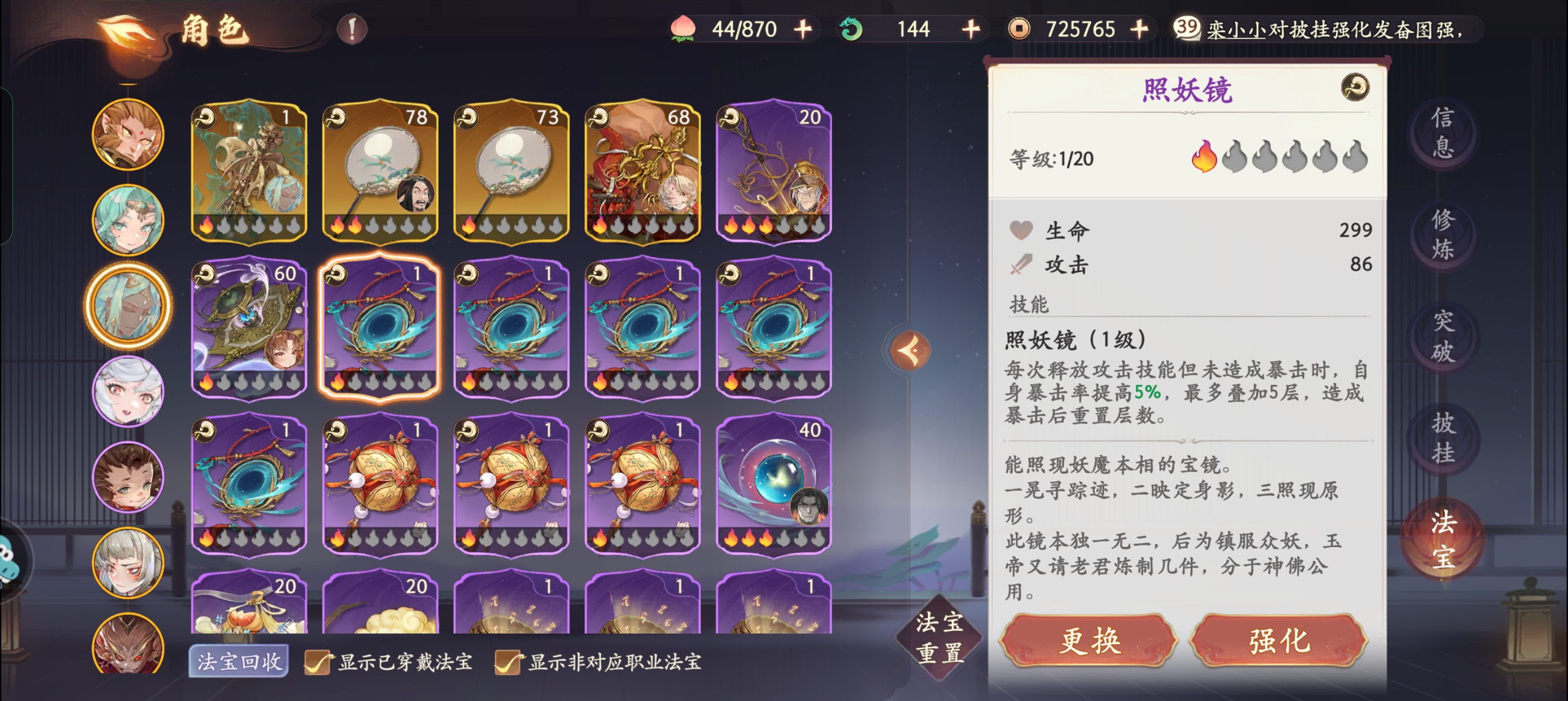 3:【法宝】推荐:众念>照妖镜>阳炎神针。专属法宝众念肯定是首选,提升暴击率,击杀延长buff时间。