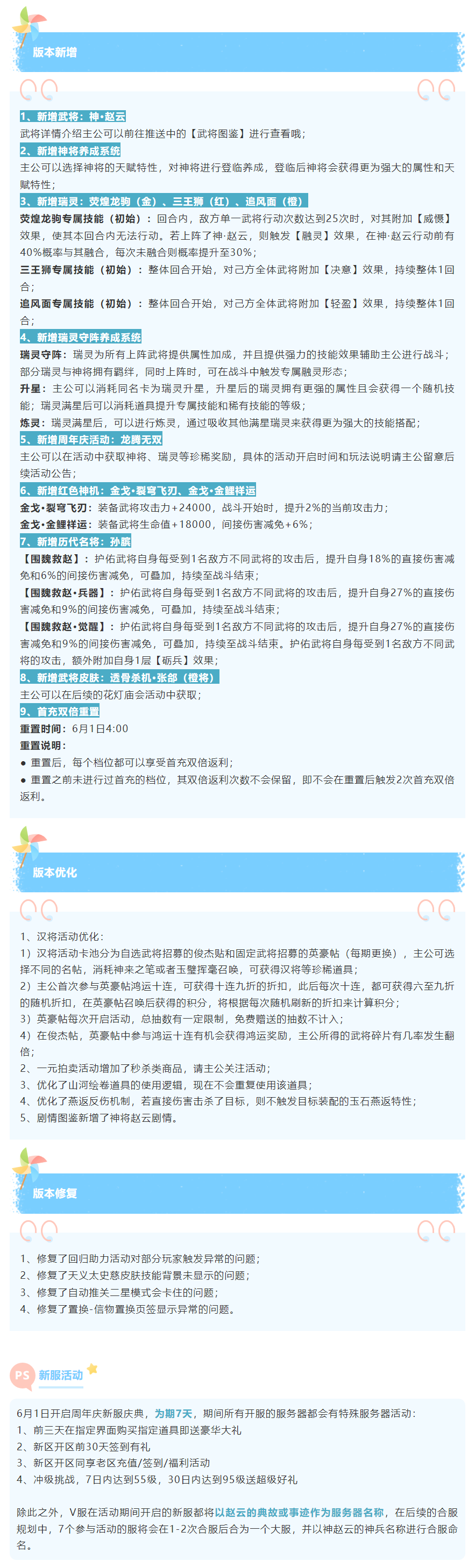 版本公告 | 5月30日更新内容一览光环小G发布于 2024-05-29关注亲爱的主公: 《三国杀名将传》将于2024年5月30日(周四)早上6:30进行停服更新,期间将无法登录游戏,预计持续4小时左右,请各位主公知晓并互相转告,具体开服时间可能会根据实际情况延后或提前,敬请谅解。V7.0版本更新福利:更新福利任选箱*1、奇珍异宝任选箱*10、元宝*1000,请各位主公在邮件中领取。