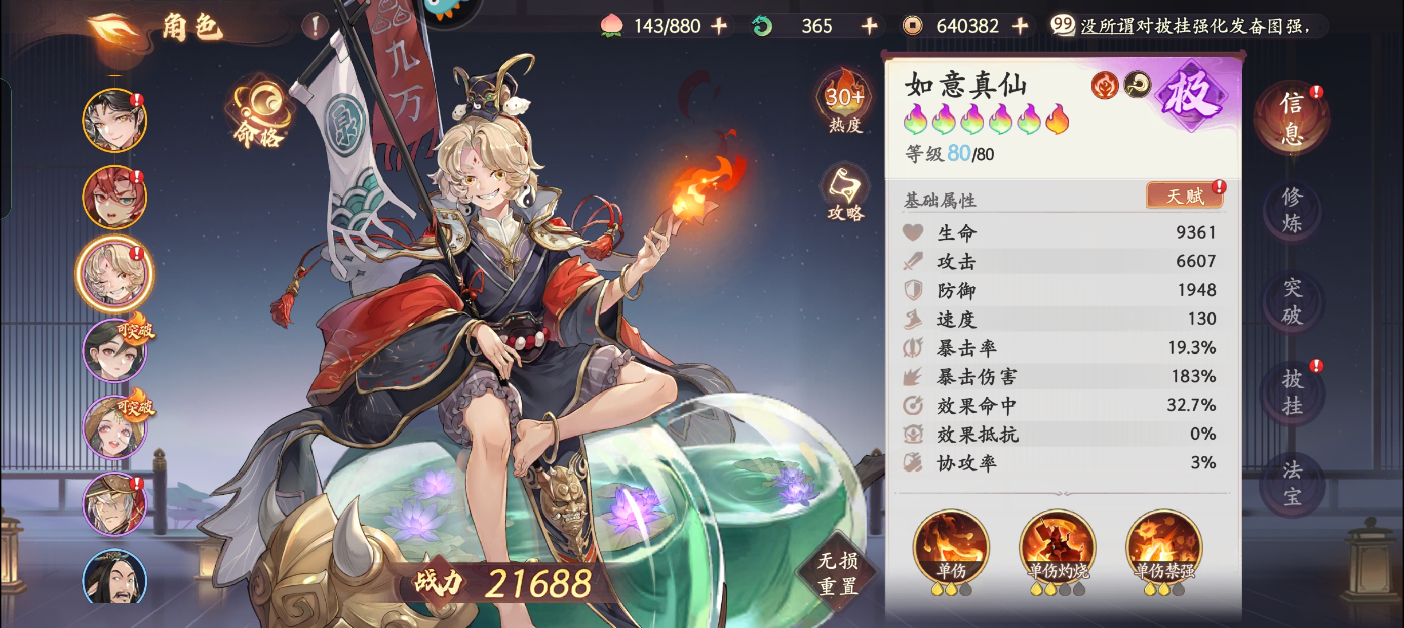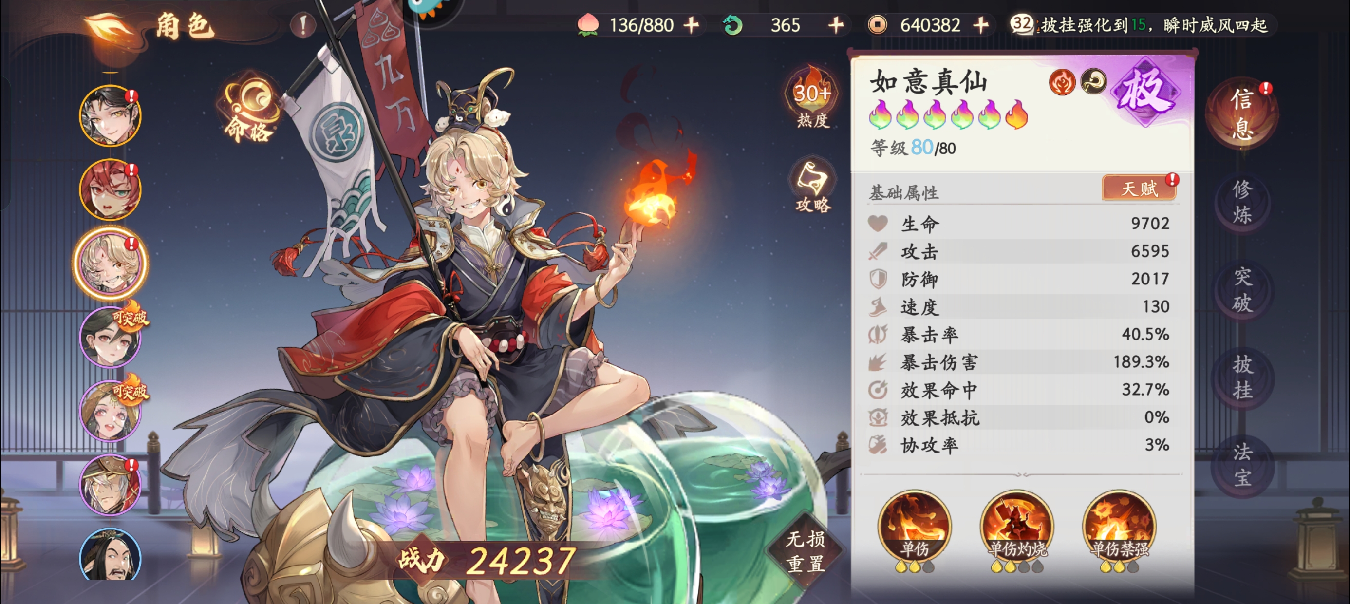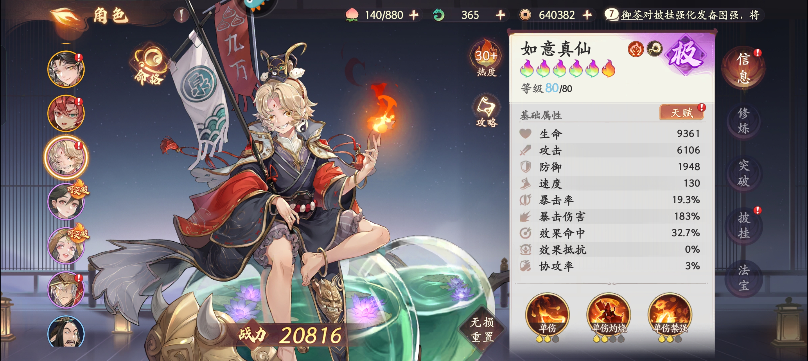 而且抽卡脸太黑了,地藏我只抽了个白板,狐狸和二郎神都是普池出的,不知道怎么玩,常驻6人得等级,命格,法宝都刷到等级上限了,剩下得体力怎么分配?我都没敢用,装备我都是推荐用的,像哪吒带的4爆伤和2暴击也不知道对不对,哈哈哈😁