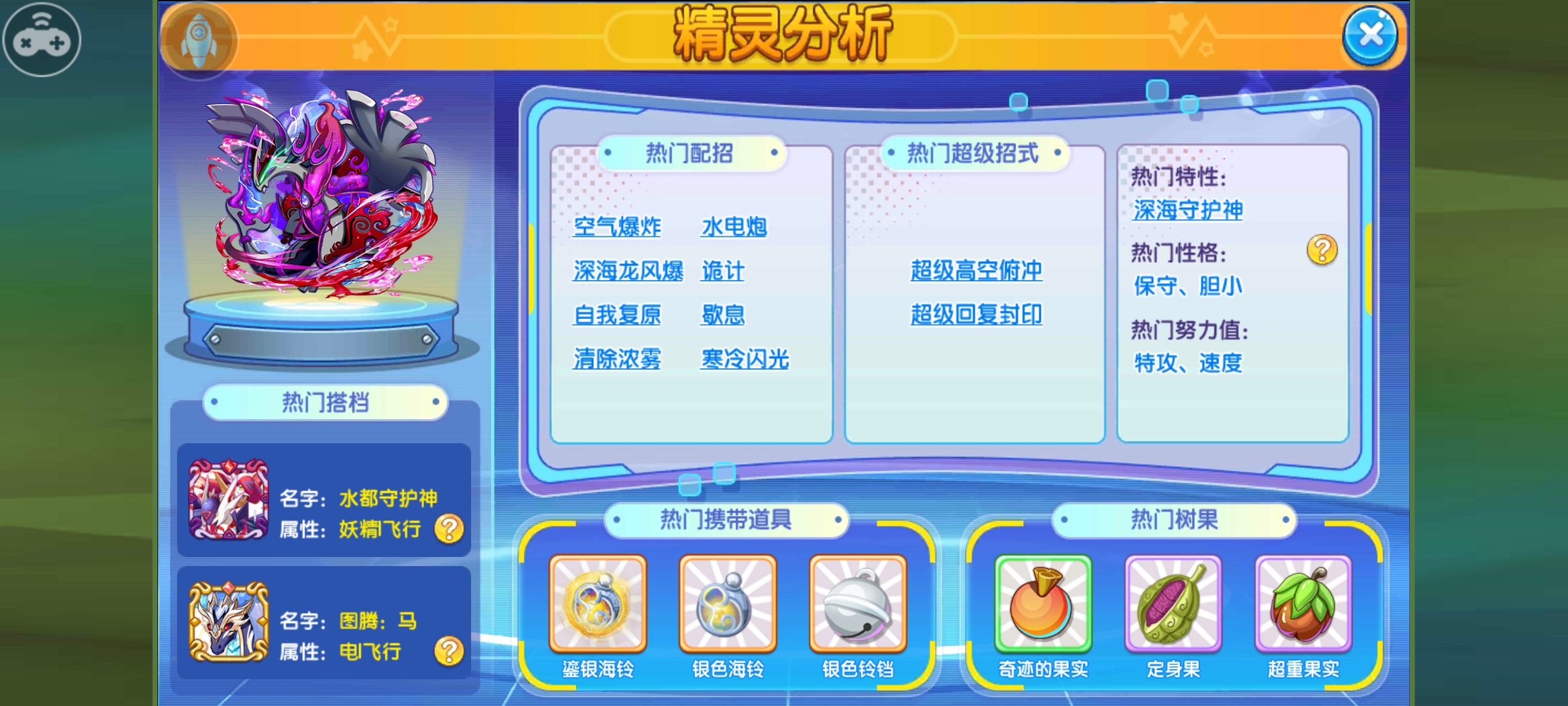 强化/回复三攻:歇息/诡计、空气爆炸、水电炮、泥石迸射/深海龙风暴
