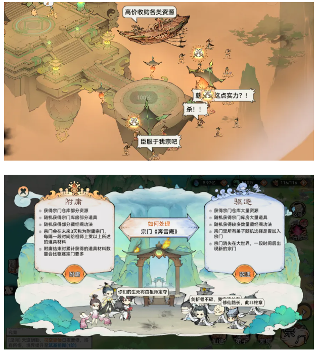 在新版本中,祖师可以选择除剧情宗门以外的随机宗门发动进攻,掠夺其库房资源,将其收为附庸或者驱逐。
