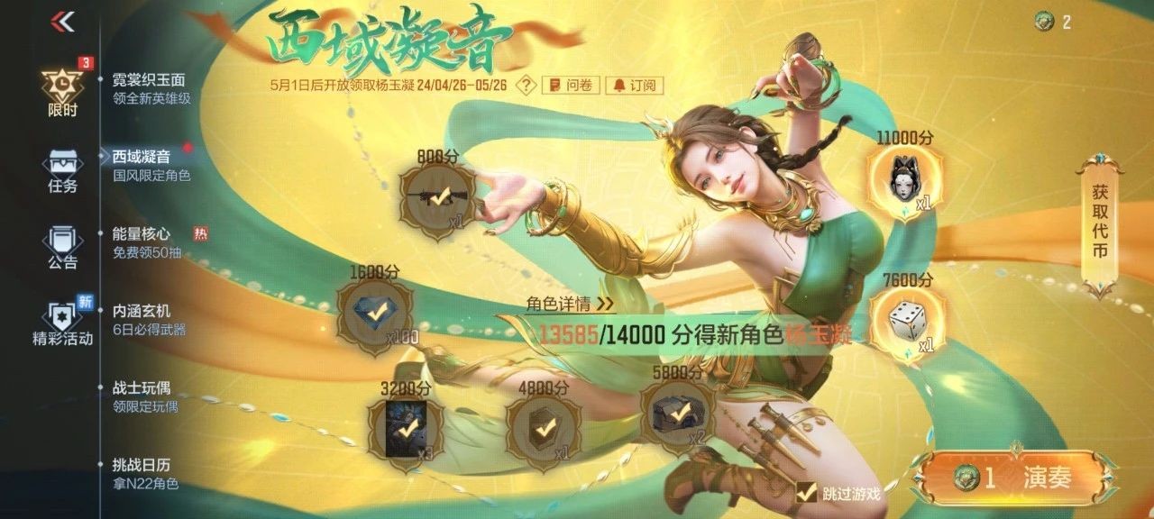 “西域凝音”核心奖励杨玉凝更是华容婀娜。秀发间的额饰尽显雍容华贵,金色护臂、高跟鞋与绿色的裙带相映,平添几分异域风情。挑战模式中的杨玉凝将轻舞胡旋,舞步轻盈、婉转似风,有着屏退异兽、惊艳山海异世的西域魅力。