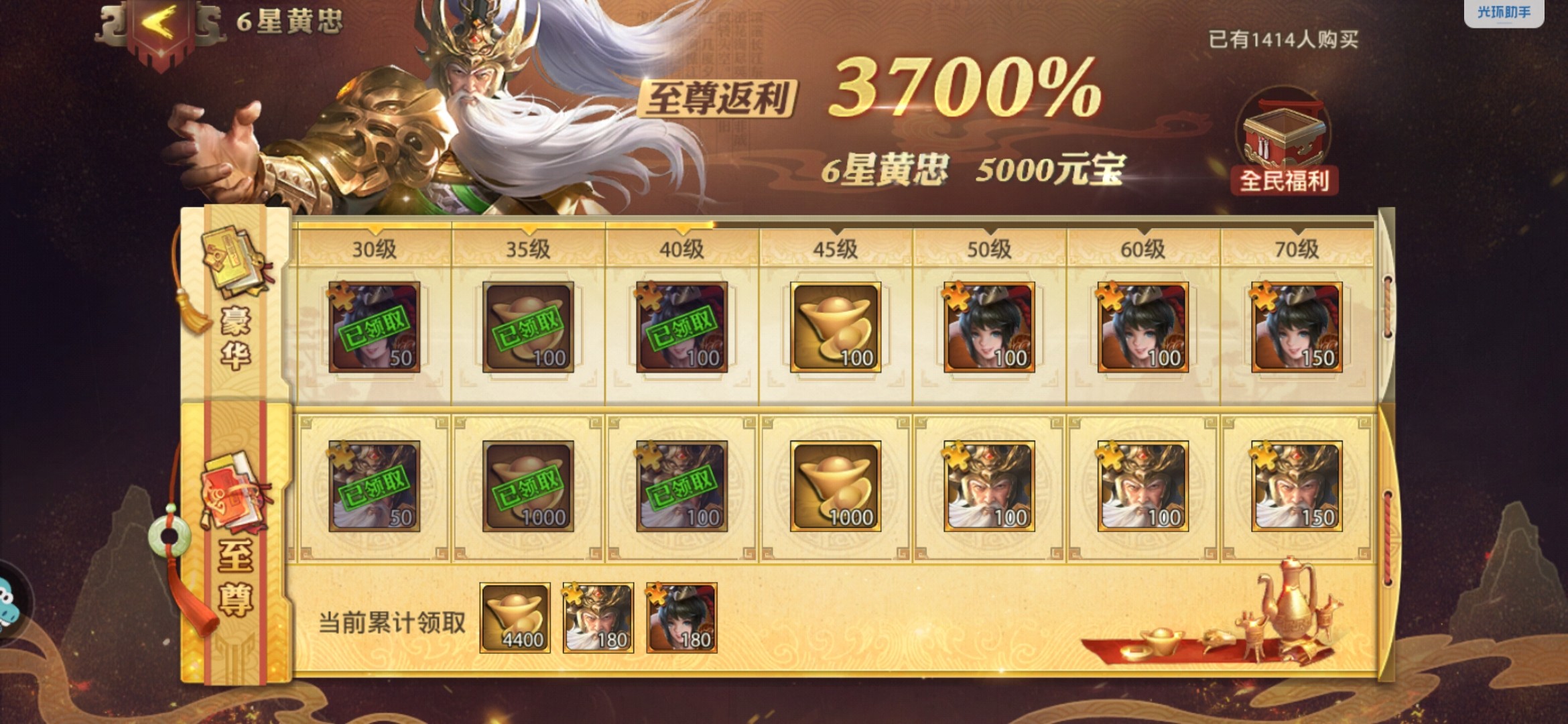 六星黄忠是按等级进行赠送,充值六星黄忠的性价比主要在于稳定的元宝与中期弓兵流的核心武将获取,尤其充值获得稳定的神将碎片获取后,在游戏前期我们可以更加节省元宝,不需要以抽奖行为补充前期武将缺失,更便于后期整体发展。