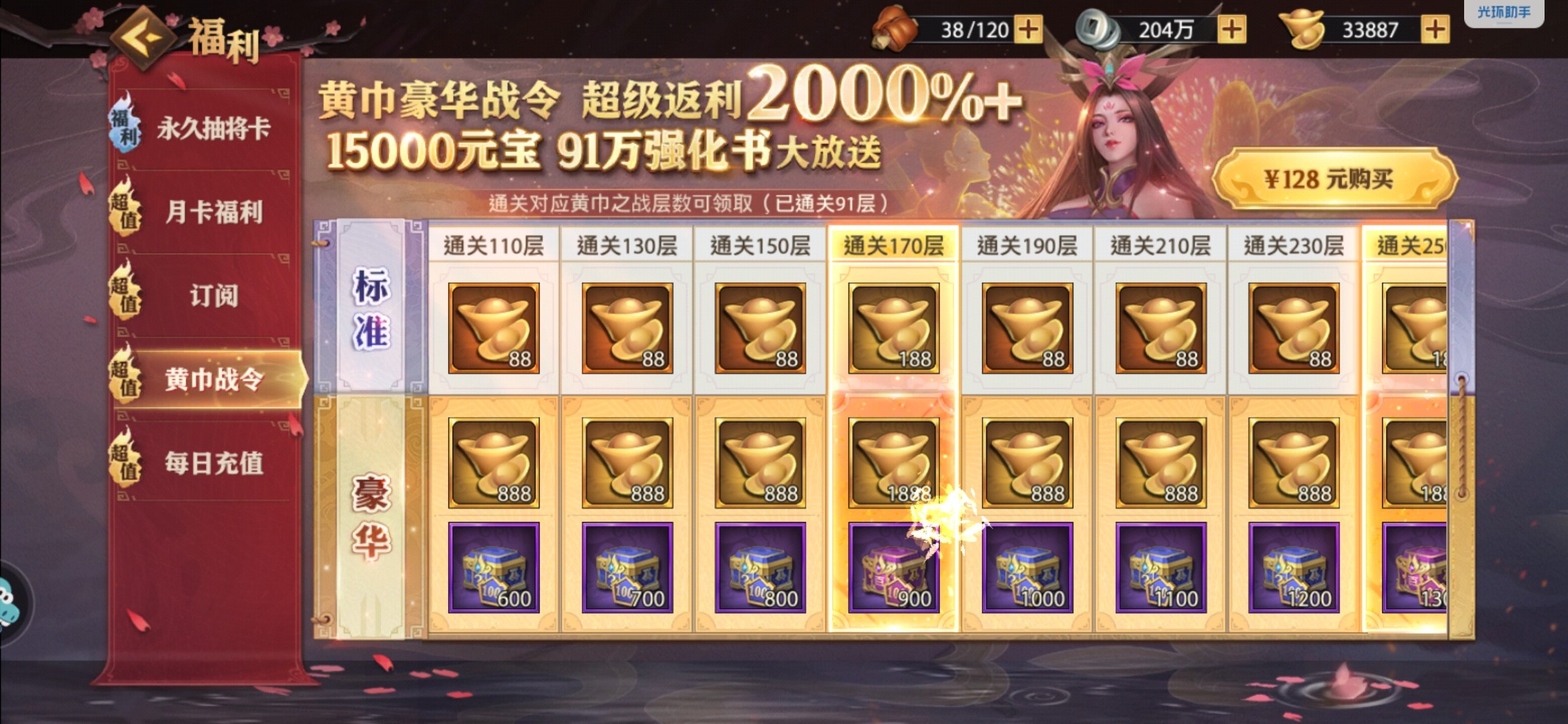 黄巾主要看黄巾之战的通关数,主要获取元宝与兵种强化书,性价比适中,毕竟兵种能力虽然在少三零中有所体现但是其并不是决定胜利天平最重要的砝码,而且按照少三零实际兵种强化书计算(100层),冲不冲实际对于兵种影响不大,除非是一口气91万强化书给玩家,如果这样黄巾堪称性价比之王。