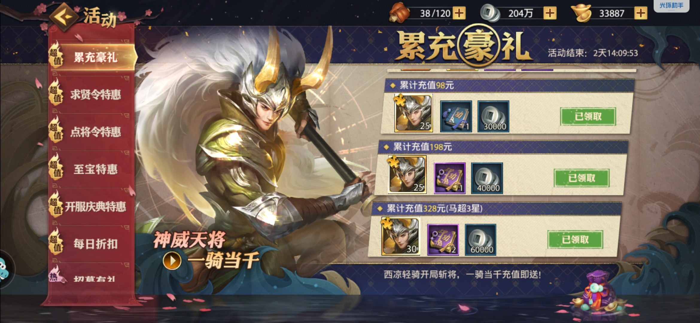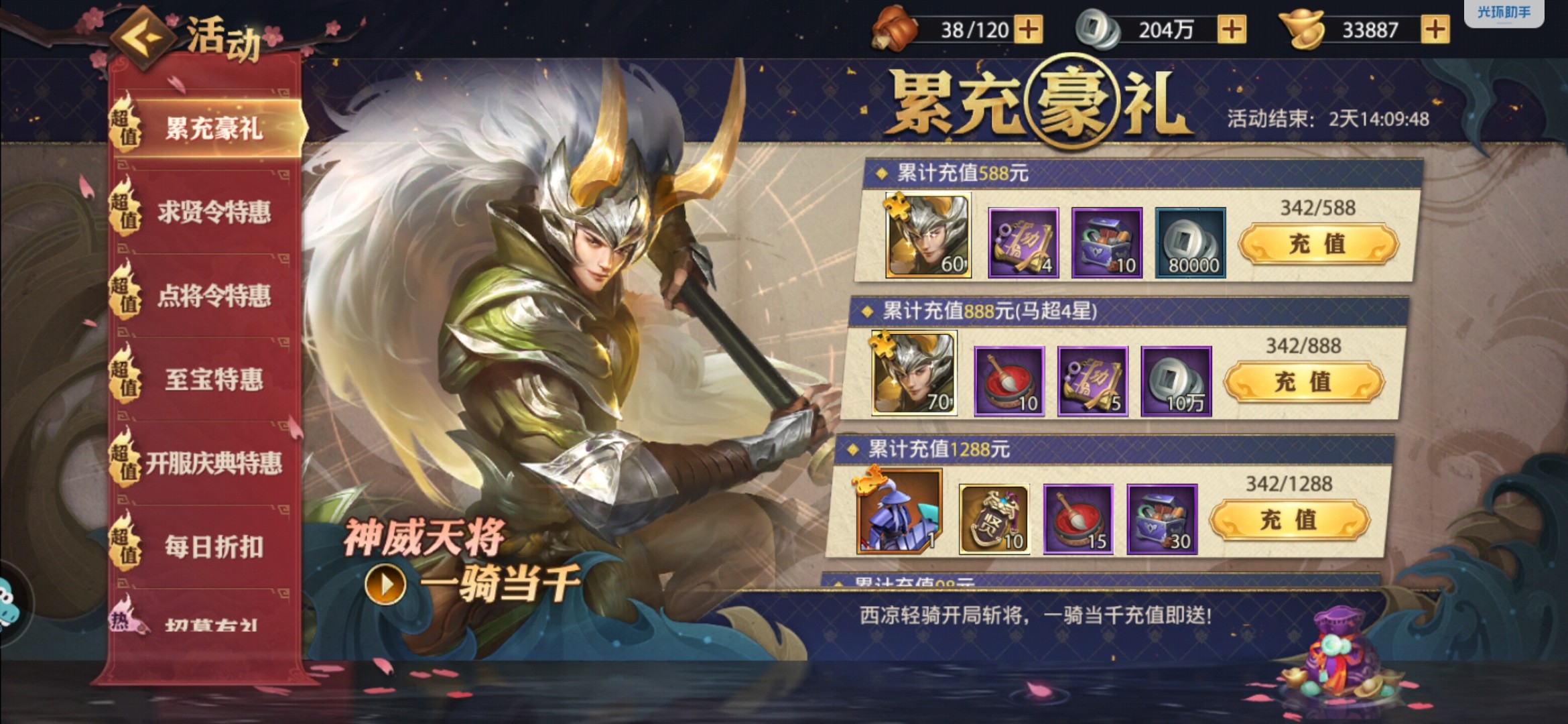 累充豪礼里面主要以328作为分水岭,因为328可以获得三星马超,组成蜀骑阵容。