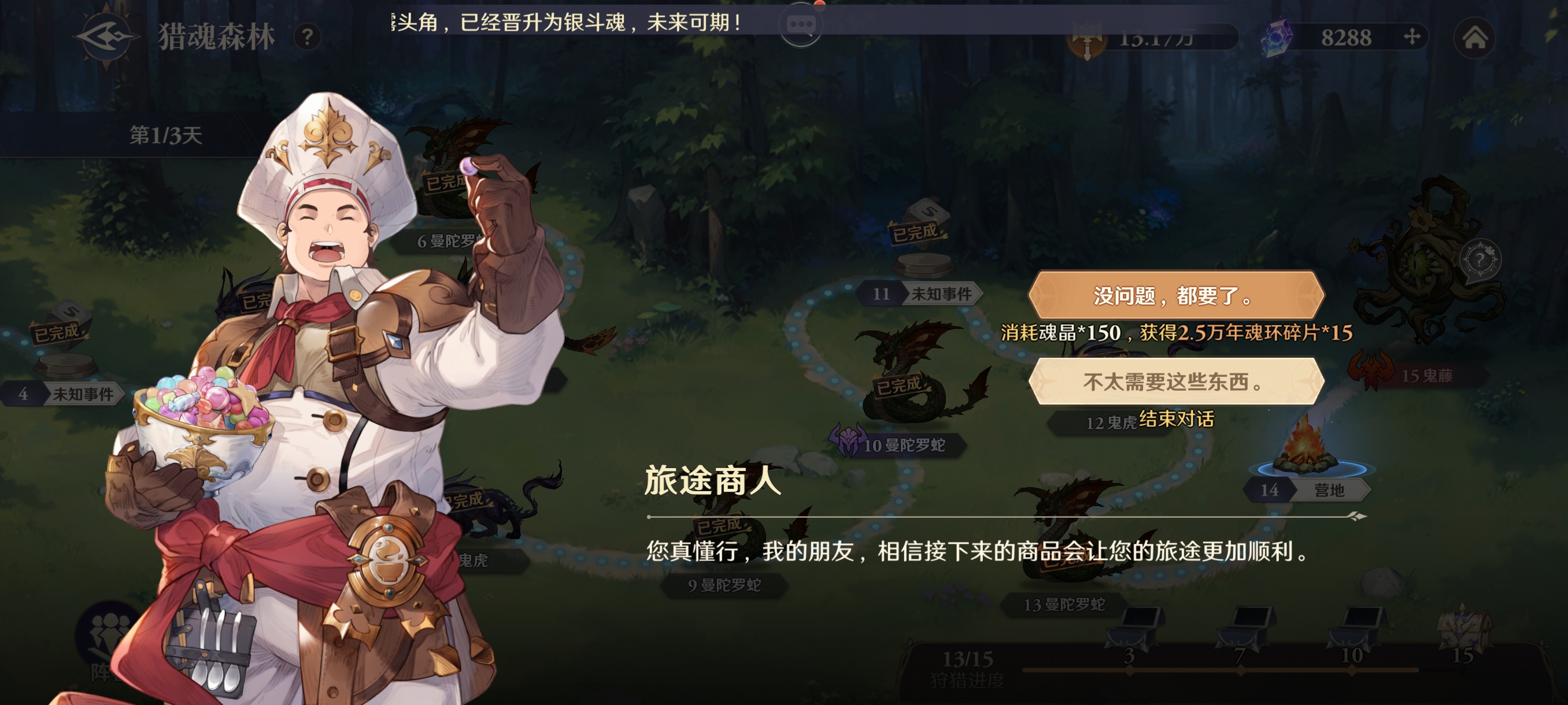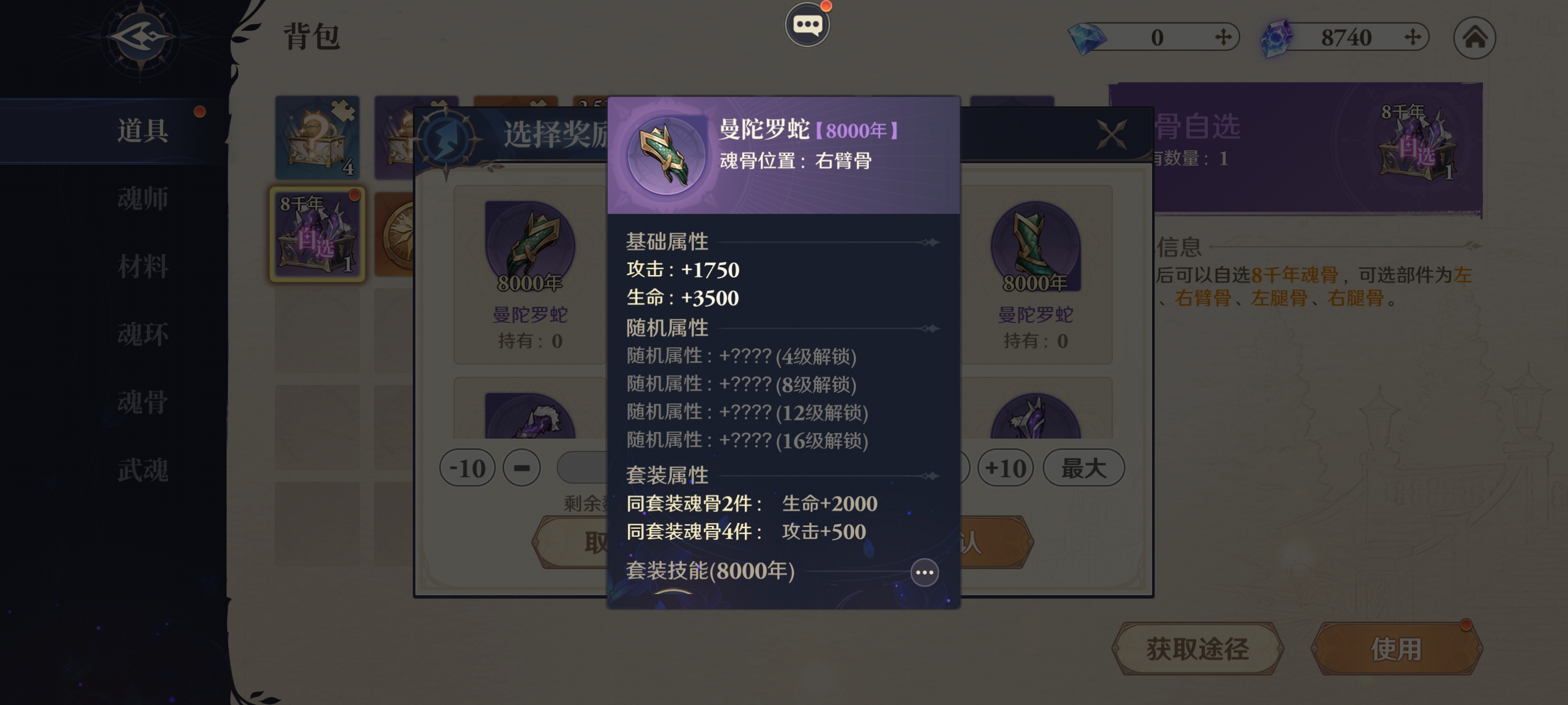 第五天送「8000年魂骨自选」,这里我主C是「比比东」所以继续兑换成「曼陀罗蛇套」的「右臂骨」。强化增加攻击力。