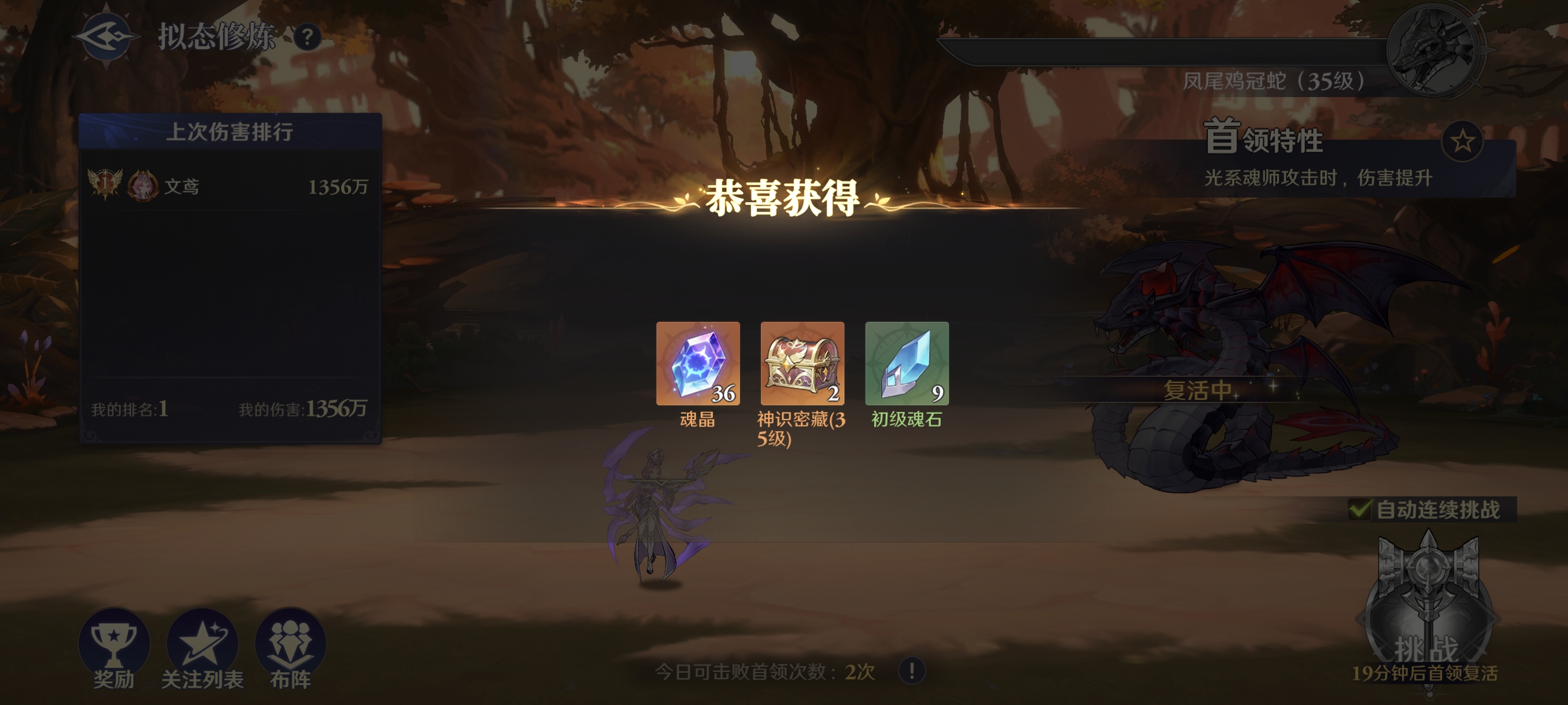 35级BOSS:第一名9个初级魂石,36魂晶;第二名6个初级魂石,24魂晶;
