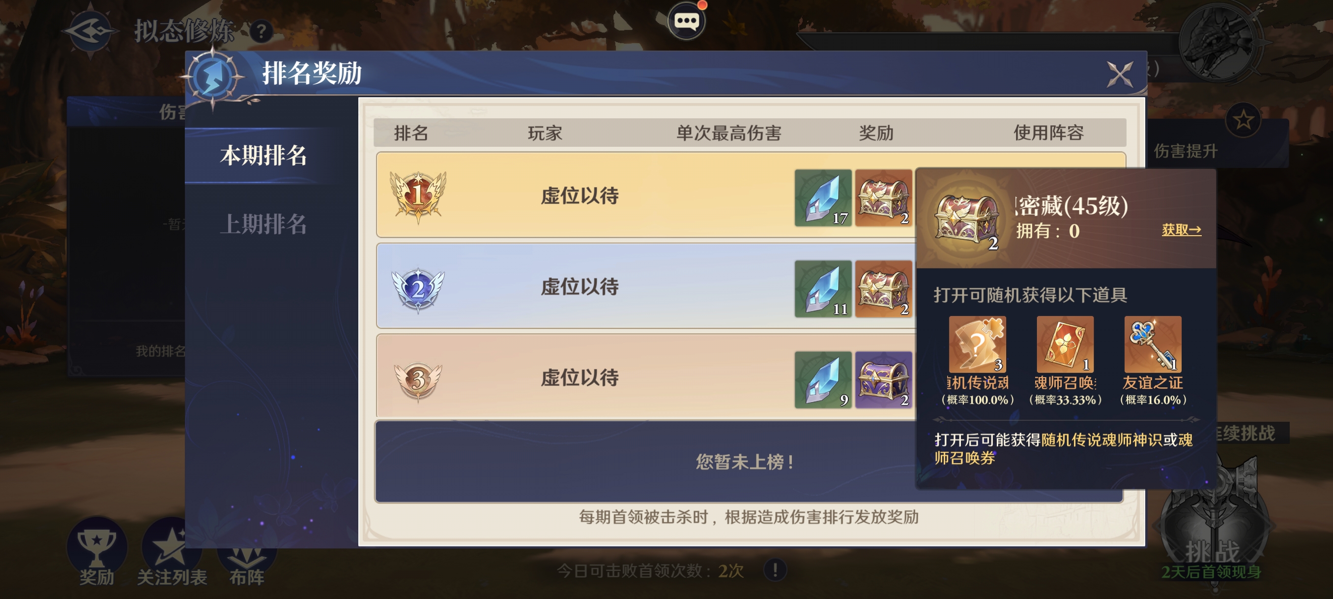 可以看出,排名越靠前,奖励是越丰富的,所以大家为了最大收益,平民玩家尽量去打低等级怪拿第一、第二奖励,也不要去和氪老抢高等级怪排名靠后没有奖励(第三名以下是没有「橙色宝箱」的,可以开出S碎片、抽卡劵和钥匙。)