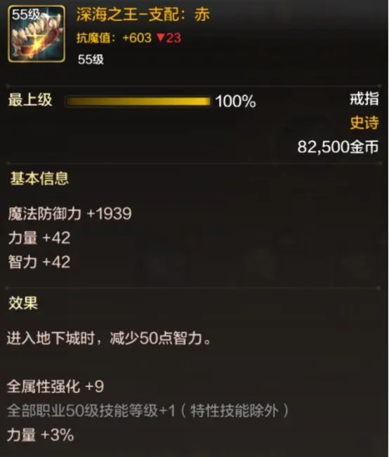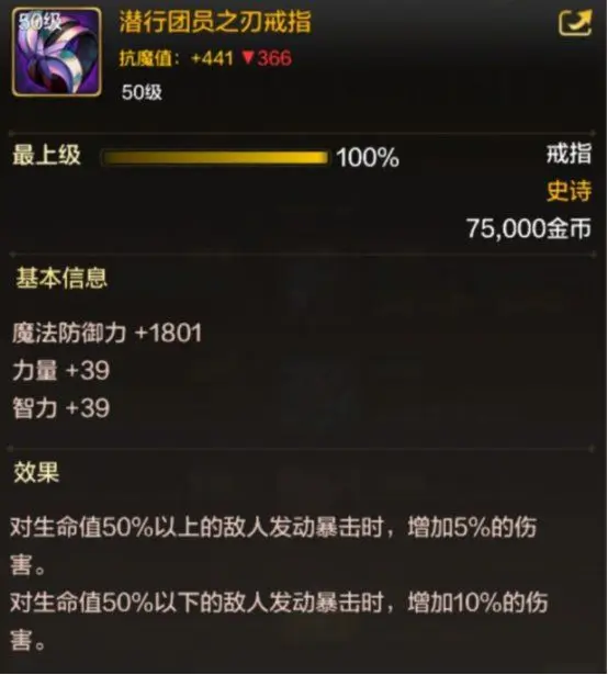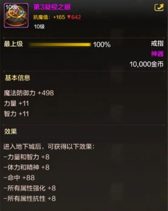 在制作功能中可以查看到该团本系列装备,戒指对各方面的属性都得到了很大的提升:面板——力量/智力+3%,伤害——全属性强化+9,技能提升——50级技能等级+1,不管从哪方面去看,都是非常给力的属性!