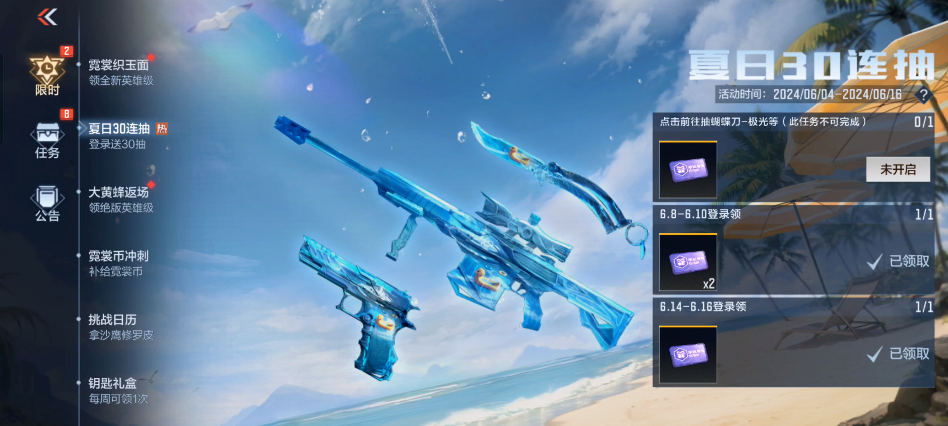 是的你没有看错,登录就送夏日清凉百抽礼包30连抽!大家只需在6月8日-6月10日登录游戏,即可直接领取2张百抽礼包十连抽券,在6月14日-6月16日登录还能再领1张。活动入口在“限时活动”页签,不要迷路了哦~