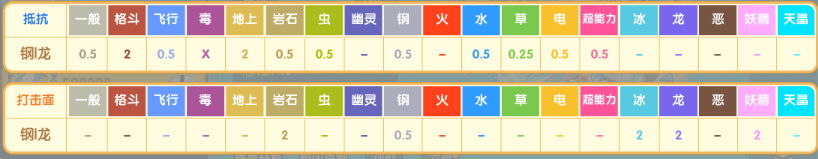 抵抗面:属性抗性表现出色,具备10种抗性,这使得它在战斗中拥有广泛的适用性。仅有的两个弱点是格斗和地上属性,但同时它能够免疫毒属性攻击。这种平衡的属性组合让铝钢桥龙成为了一个非常优秀的精灵。由于它的这些优势,铝钢桥龙在多种战斗场景中都能轻松登场,为训练师提供强大的支持。