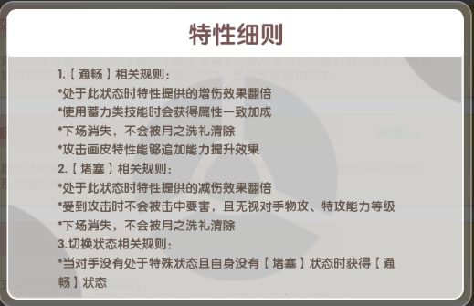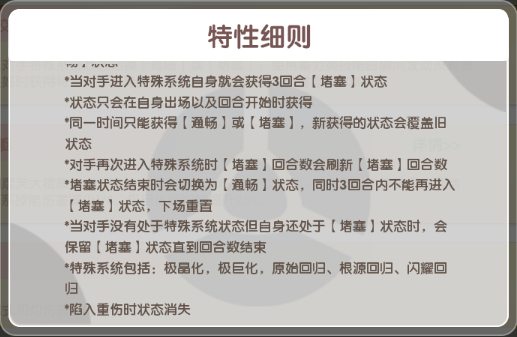 1、根据对手自适应切换状态十分灵活,动有【通畅】状态暴力输出,静有【堵塞】状态面对特殊系统不动如山;使用蓄力类技能效果不好则自带强化。