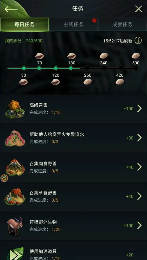 记得使用加速道具、给奇异火龙果浇水等小操作可以获得小额积分,集结狩猎野生兽群、召集各类野兽可以获得大额积分哦!