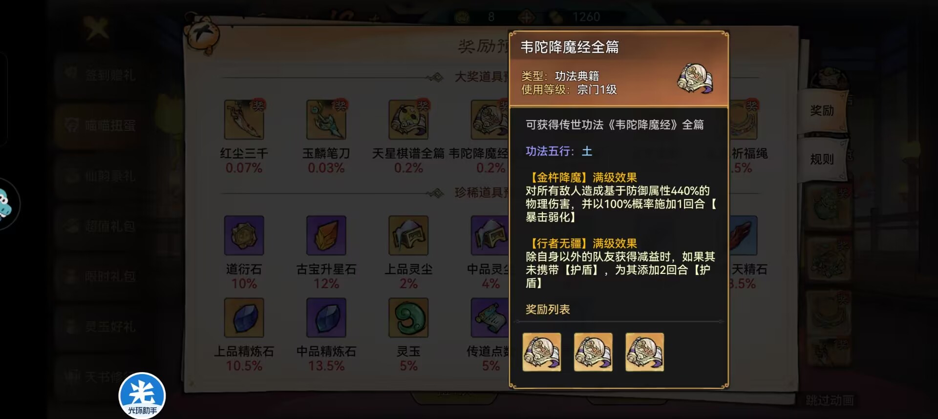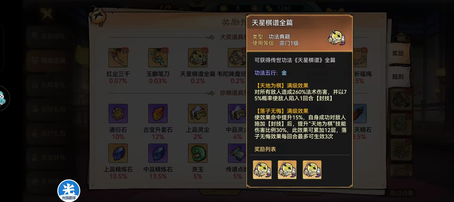 ②新功法:【天星棋谱】。首先这本新功法强度也是在线的,这点喷不了全体伤害+全体封技,被动还可以提前命中率,同时增加功法伤害,每层可以增加30%伤害,最高可以叠加12层。