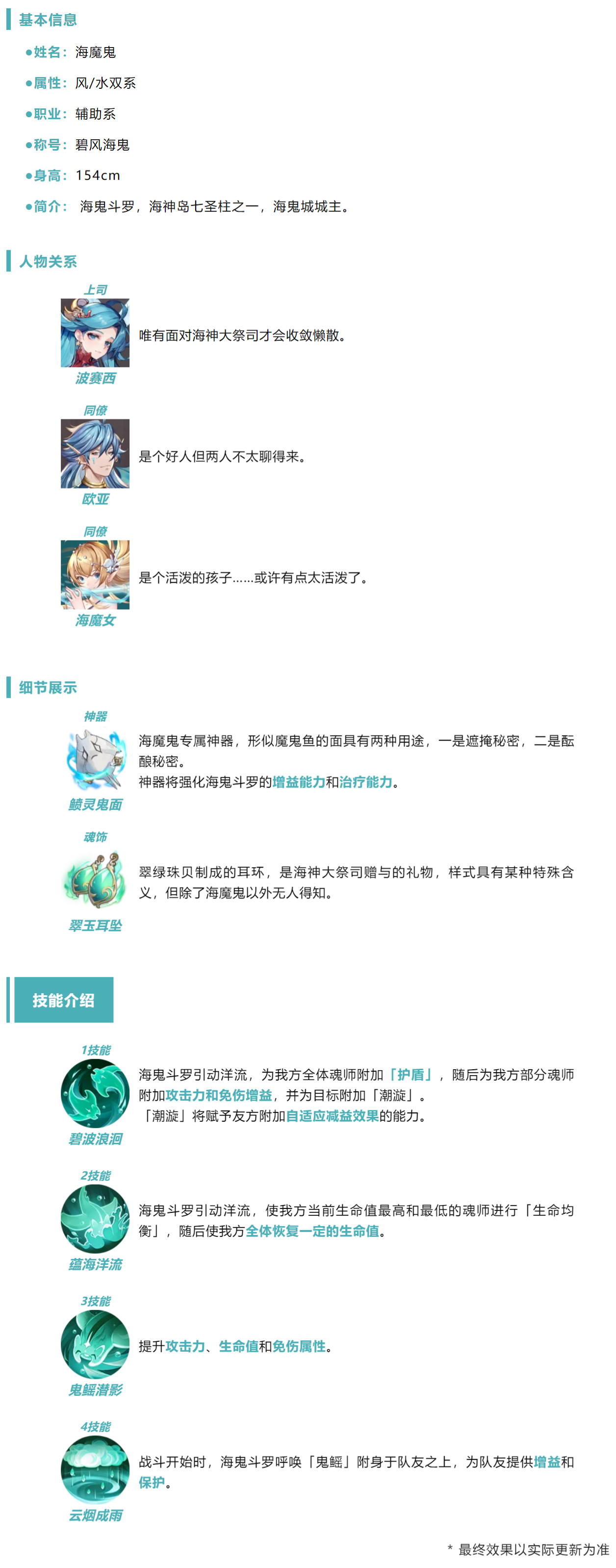 海鬼斗罗,别名“海魔鬼”,现任圣柱守护中最资深的一位,亦是海鬼城城主。海魔鬼的武魂是海鬼鱼,这是一种可以肆意浮游的武魂,看似无害的外表之下隐藏着危险的能力,它能够悄无声息地制造剧毒,而中毒者将被困于毒素带来的幻境,饱受精神上的痛苦折磨,直至死亡。
