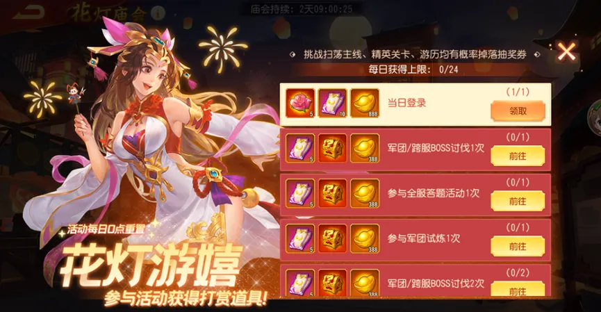 在活动期间,主公可以通过完成每日活动任务,来获得抽奖券以及其他奖励。主公挑战或者扫荡主线副本、精英副本、游历也有概率获得抽奖券哦,每日上限为24个。