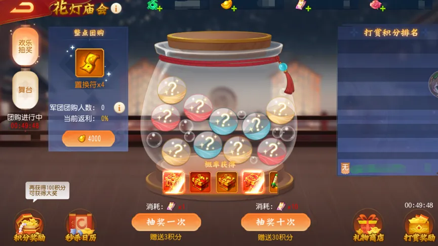 2、主公可以在积分排行榜开放时进行欢乐抽奖、舞台打赏,获得活动专属奖励和活动积分,活动积分可以参与每轮的积分排行榜排名。