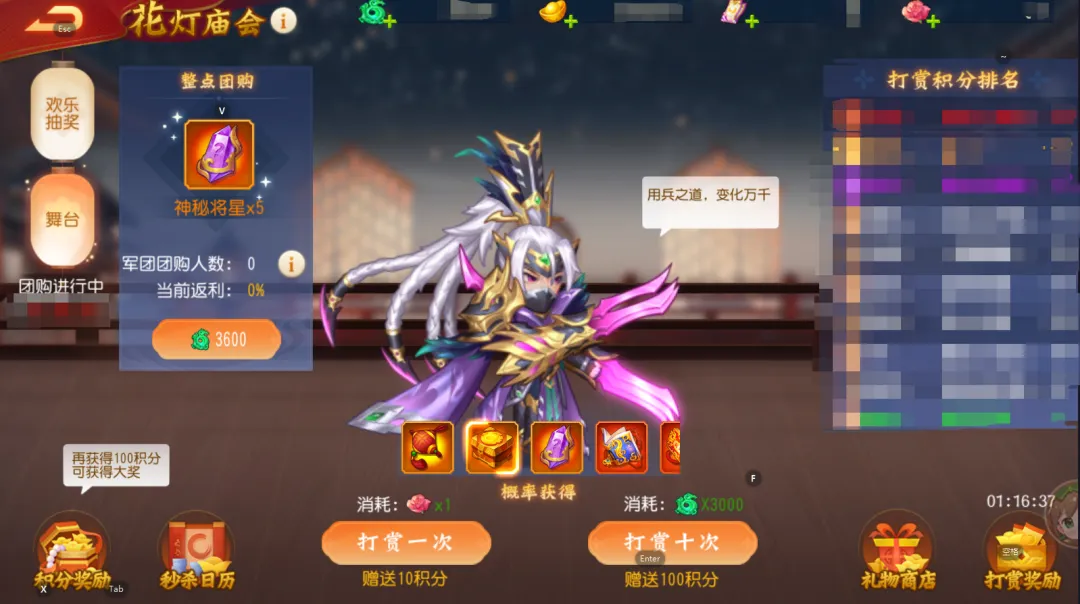 2)舞台打赏:主公可以在积分排行榜开放时进行舞台打赏,每一次打赏增加10积分;主公每日登录、活动商店购买活动礼包可以获得鲜花用于打赏,当鲜花道具不足时,可以消耗玉璧购买鲜花进行打赏。