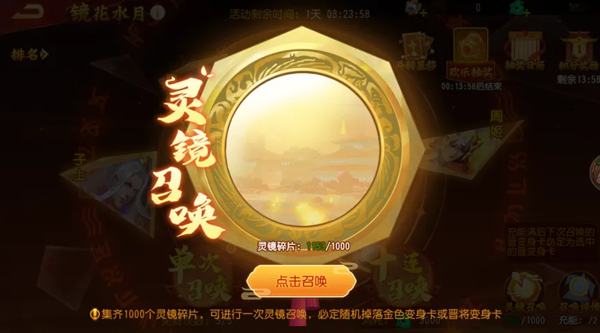 1、主公在镜花水月活动的召唤过程中,有概率获得灵镜碎片,集齐1000个灵镜碎片,可进行一次灵镜召唤。