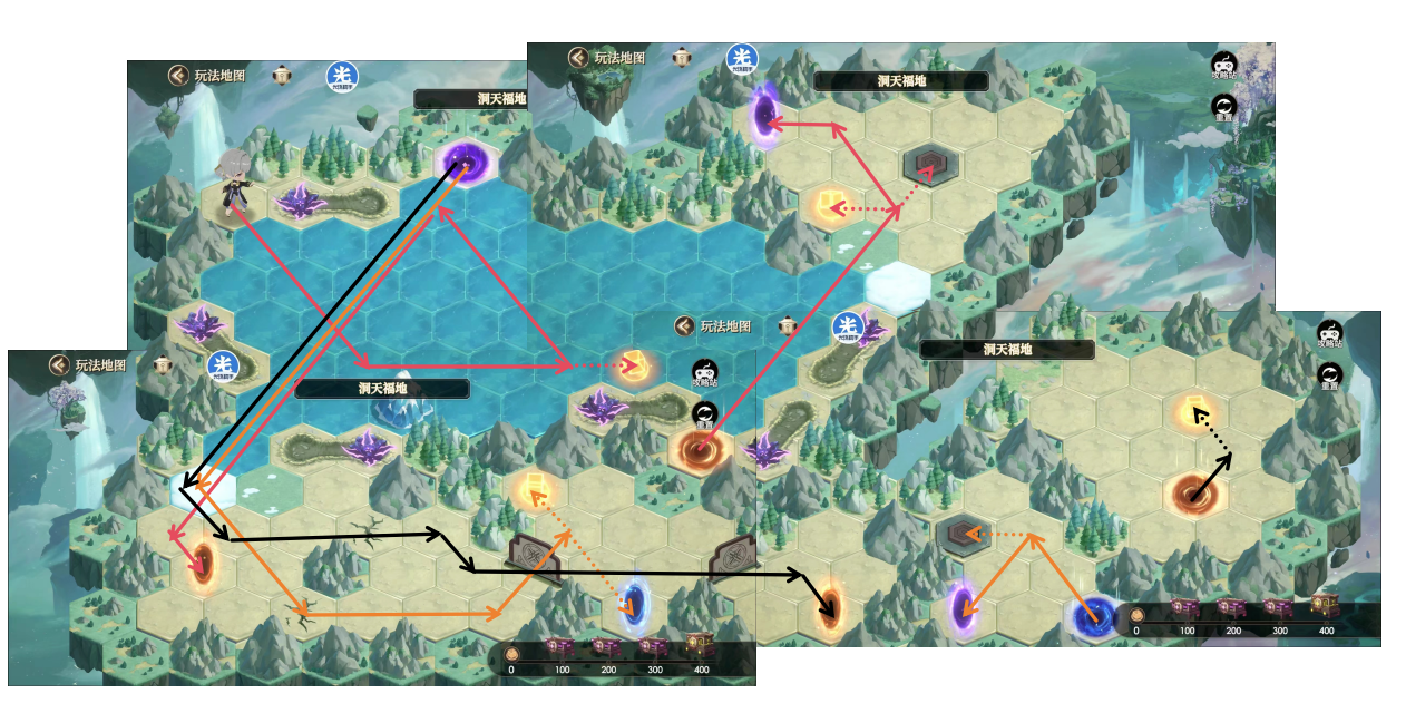 洞天福地解密系列-23深渊断罪发布于 2024-06-13关注本文首发于光环助手,未经授权不得转载!洞天福地23 路线说明*虚线为只拾取不进入格子!1、从初始位置沿红色路线前进,拾取奖励后,进入橙色传送门。2、从橙色出口继续沿红色路线前进,拾取奖励打开机关后,进入紫色传送门。3、从紫色出口沿橙色路线前进,拾取奖励后进入蓝色传送门。4、从蓝色出口沿橙色路线,打开机关后,进入紫色传送门。5、从紫色出口沿黑色路线前进,进入右下角的橙色传送门,拾取奖励后通关。