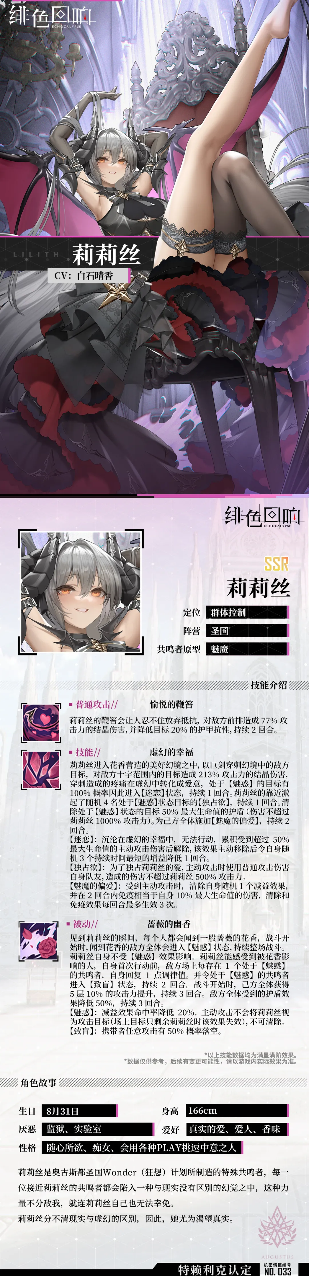 莉莉丝是奥古斯都「Wonder(狂想)计划」所制造的特殊共鸣者,每一位接近莉莉丝的共鸣者都会陷入一种与现实没有区别的幻觉之中,在幻觉中的人会将莉莉丝视为自己最珍爱的人,会因为她在自己身边而感到幸福。这种力量不分敌我,就连莉莉丝自己也无法幸免。莉莉丝分不清现实与虚幻的区别,因此,她尤为渴望真实。