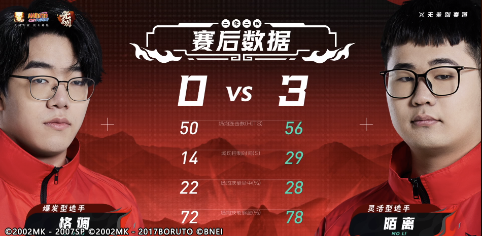 败者组第一轮第1场,陌离对阵格调。第一局,陌离的秋道丁次「忍界大战」打出优势,赢得胜利;第二局陌离一度陷入劣势,但最终用漩涡博人冷静应对,实现反败为胜。之后陌离赢下了自己的赛点局,以3:0淘汰格调。
