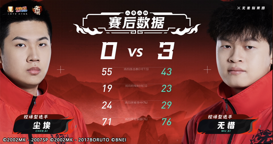 总决赛第二天战况速递胜者组第一轮第1场,无惜对战尘埃。首局,无惜用野原琳「元气少女」多次长距离技能拉扯打出血量优势,随后用萨姆伊「忍界大战」拿下胜利。之后无惜乘胜追击,再次赢下两局胜利,3:0战胜尘埃。