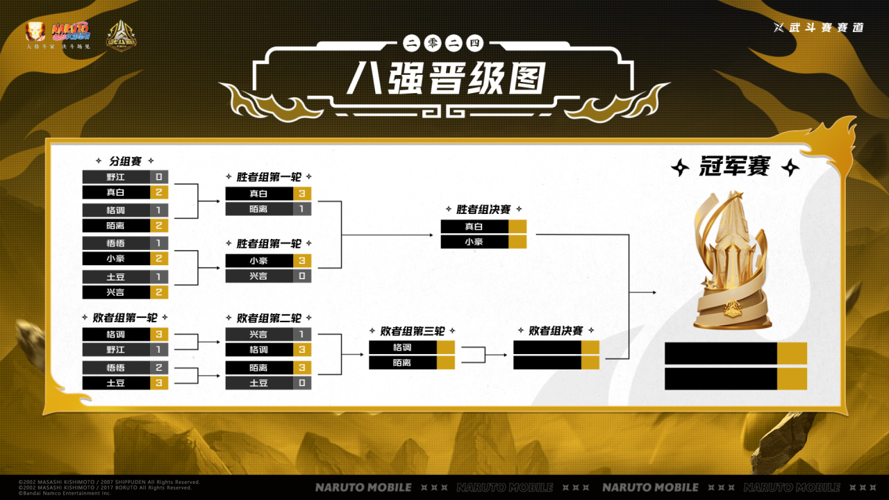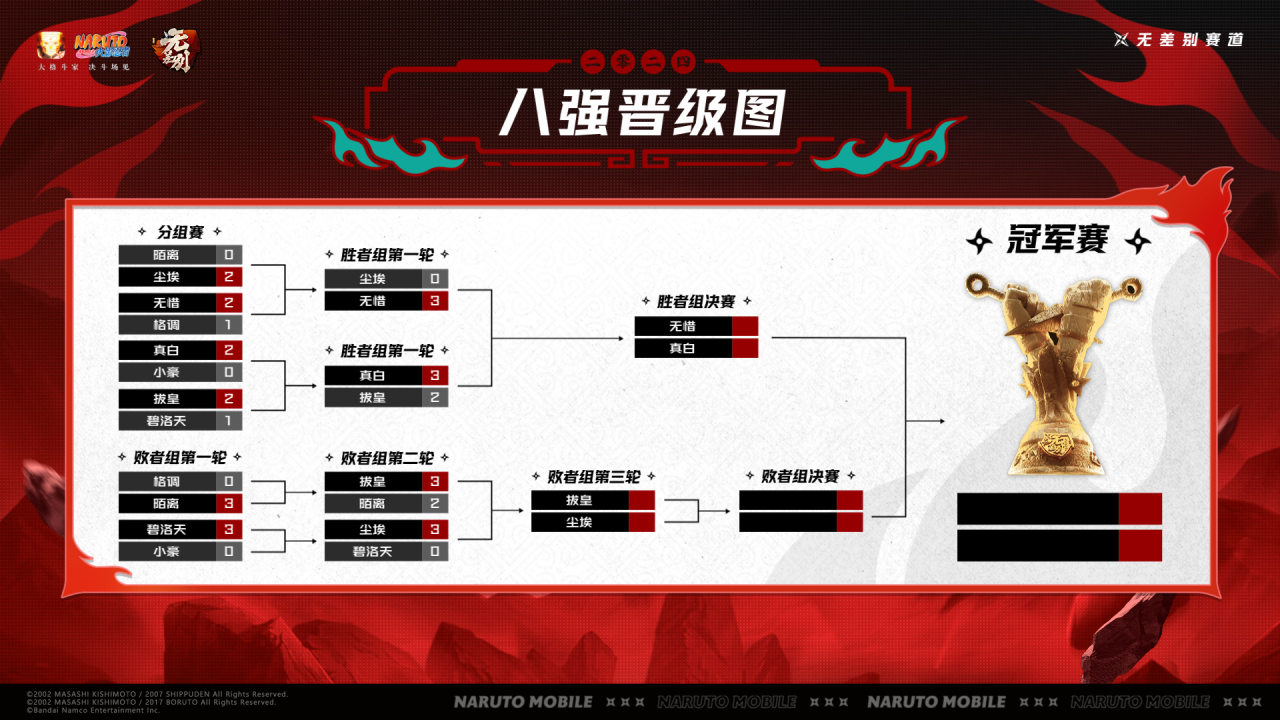 总决赛无差别赛道战况总决赛第二天赛果2024《火影忍者》手游春季赛总决赛无差别赛道的分组赛中,尘埃、无惜、真白、拔皇进入胜者组,陌离、格调、小豪、碧洛天落入败者组。胜者组方面,无惜和真白晋级胜者组决赛;在败者组,拔皇、尘埃最终晋级败者组第三轮。