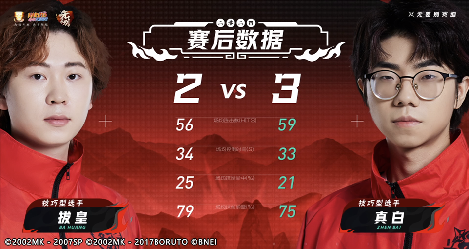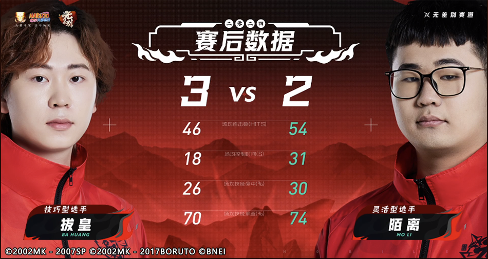 败者组第二轮第1场,拔皇对阵陌离。经过四局焦灼的战斗,双方各获得两局胜利。第五局决胜局,陌离的并足雷同连穿拔皇两名忍者,但拔皇临危不乱,成功反三。最终,拔皇3:2险胜陌离。