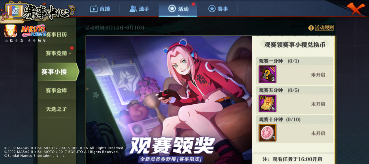 无差别晋级图 观赛领赛事小樱赛事小樱来为春季赛总决赛加油助威啦!6月14日-6月16日比赛直播期间,学员可前往“忍者大赛-赛事直播”观看实况直播,完成观赛任务即可领兑换币,集齐两枚兑换币即可前往游戏内活动中心兑换春野樱「赛事限定」!