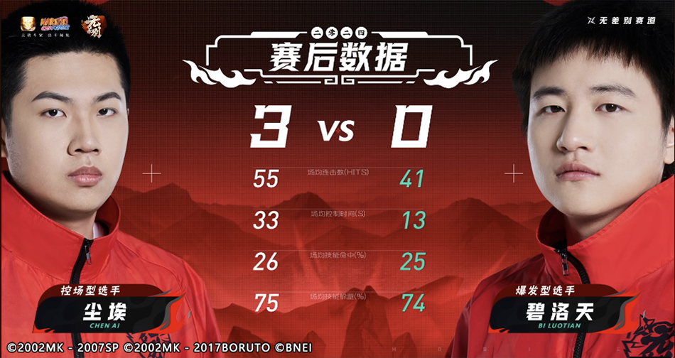 败者组第二轮第2场,尘埃对阵碧洛天。尘埃的宇智波佐良娜满血拿下碧洛天两名忍者,建立巨大优势赢得首胜;之后,尘埃分别用月光疾风「七夕限定」和天天「忍界大战」拿下两局胜利,3:0淘汰碧洛天。