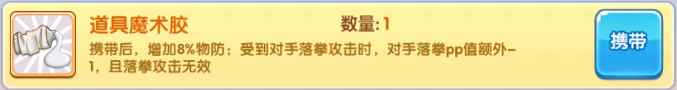 现在版本的辅助宝可梦基本都配戴了一手落拳,这样队伍的主力宝可梦就会显得非常被动,所以我们可以携带道具魔术胶为队友抵挡落拳带来的影响。