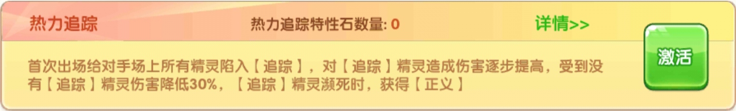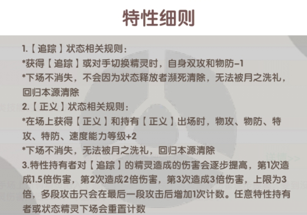 ·首次出场给对手场上所有精灵陷入[追踪],对[追踪]精灵造成伤害逐步提高,受到没有[追踪]精灵伤害降低30%,[追踪]精灵濒死时,获得[正义]