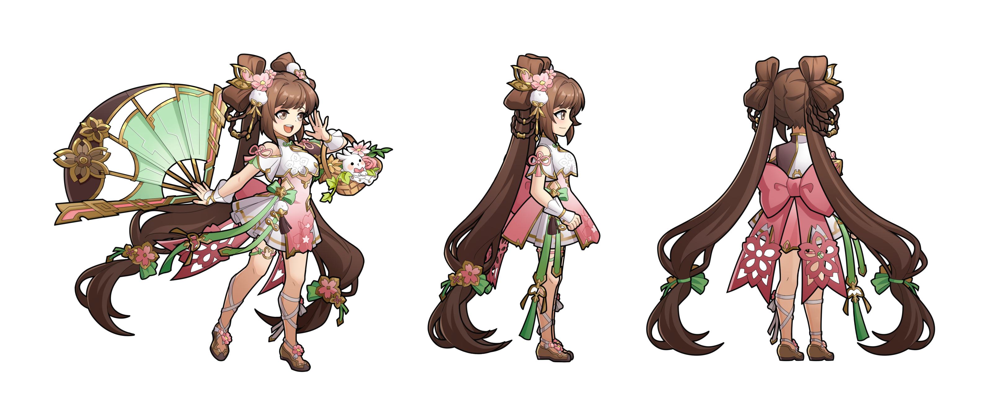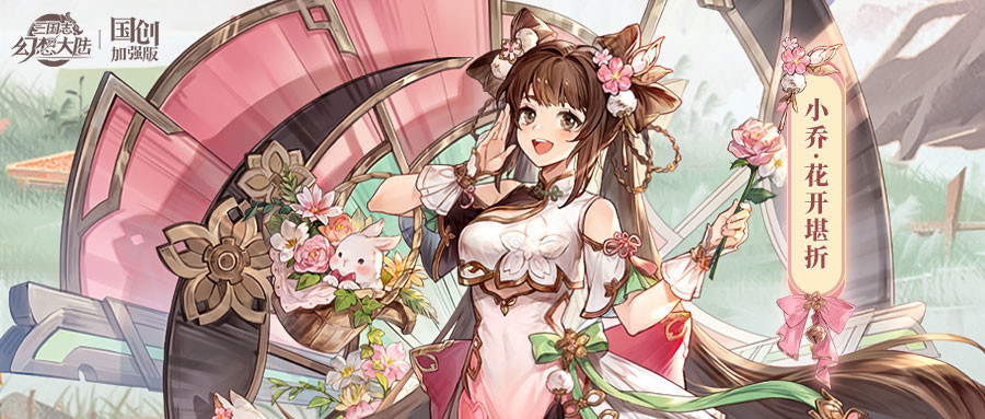 皮肤以粉白为主色调,以市井生活中的卖花小女孩为设计主题,粉色契合花的颜色,再加入浅绿色作为点缀,短款褶裙的样式更显小乔元气可爱。花瓣镂空装饰身后的蝴蝶结,俏皮灵动。小乔推着满载鲜花的机关车走街串巷,竹篮中有被鲜花吸引的小白兔陪伴着她,武器上的兔子图案是小乔和兔兔友谊的证明!